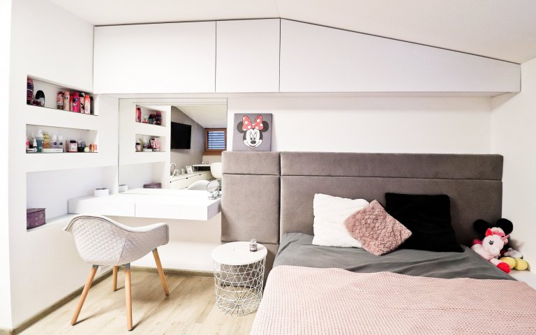 Jeden takový případ nastal v rodině na západě Čech. Podkrovní pokoj dospívající slečnu vyžadoval celkovou rekonstrukci a s tím spojenou obnovu stávajícího nábytkového vybavení.