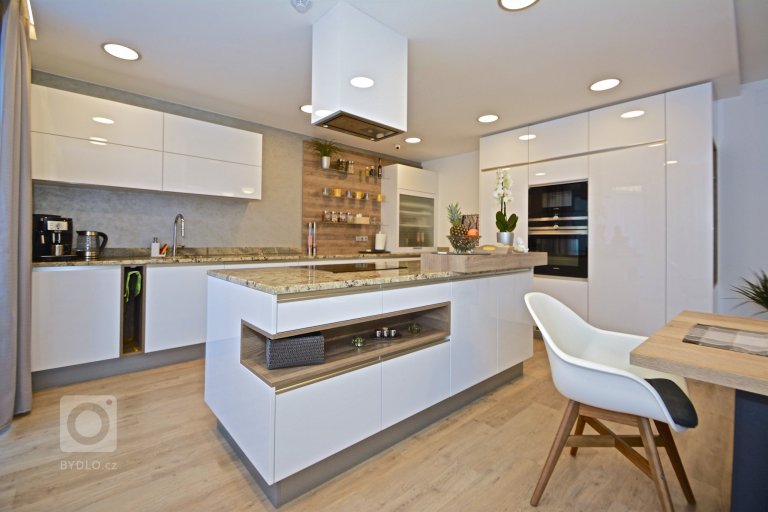 Mladý pár se pustil do složité rekonstrukce, ale pomocí nás a ateliéru ATAK jsme dům dovedli do dokonalosti. Co Vás může zaujmout je kuchyň, která je velmi prostorná a zajimavá je skleněná roleta. Z materiálu jsme použili lesklý bílý lak, dub gladstone šedobéžový a pracovní desku z přírodního…