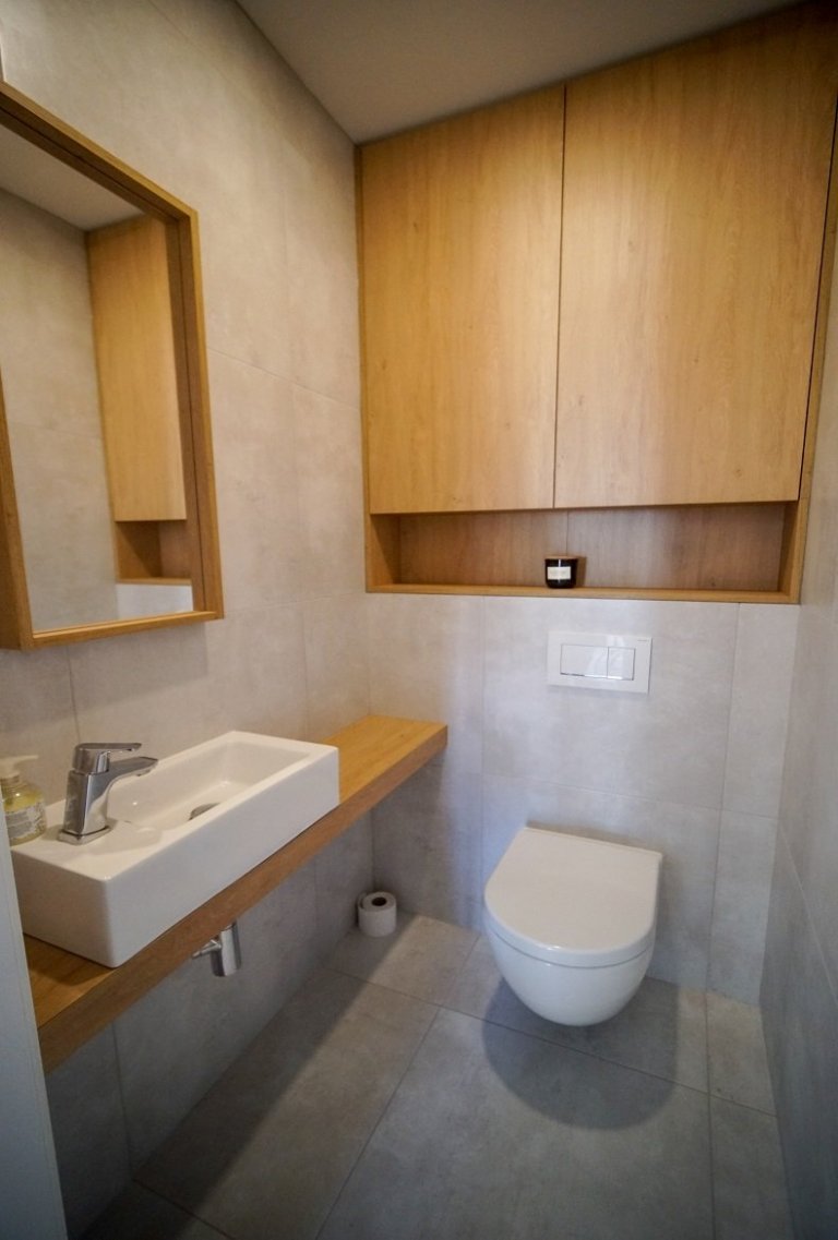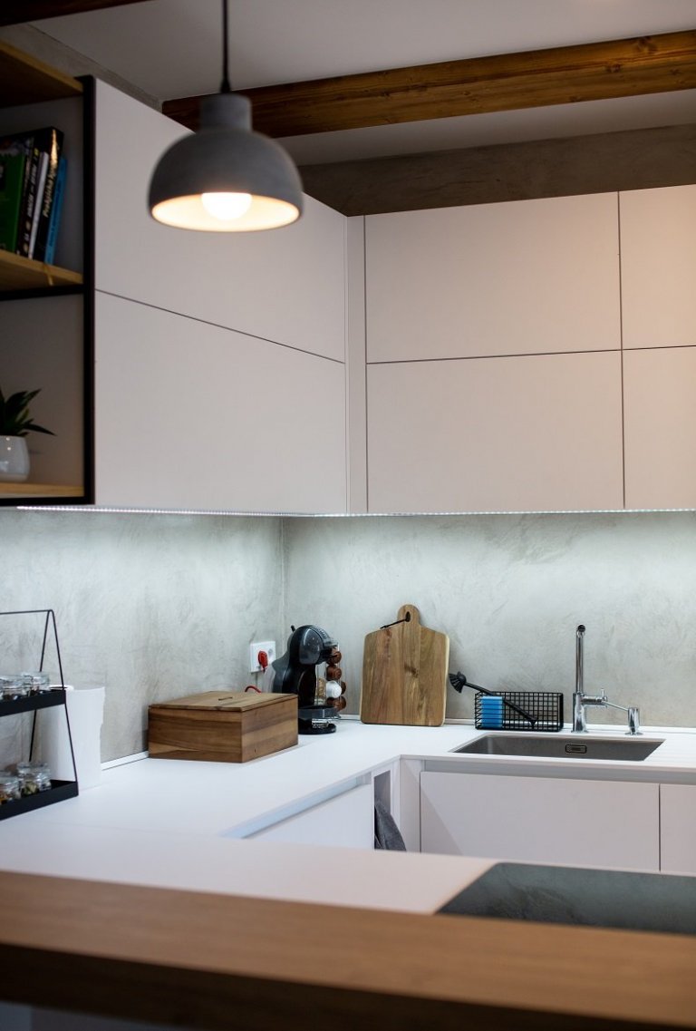 Interiér v minimalistickém stylu, který je laděn do čisté bílé matné doplněné dřevem, trámy a vhodnými doplňky. Interiér je jednoduchý, útulný a svěží.
