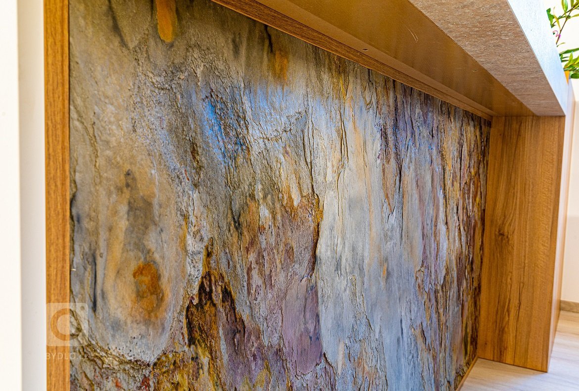Bílá kuchyň v lakovaném matu PerfectSence je doplněna dekorem ořechu. Dominantou kuchyně je ostrůvek s podsvícenou kamennou dýhou. Interiér je světlý a vzdušný.