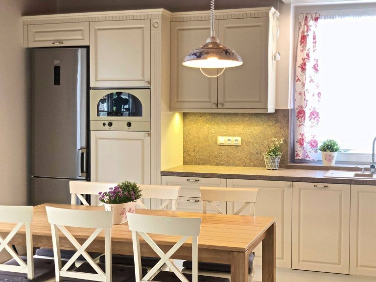 Tentokrát rustikální kuchyně s jídelnou, úžasným stropem a podlahou. Lakovaná slonová kost, dekor kamene a masivní dub, dýha a kondesign. Pár detailů se tady taky najde.
