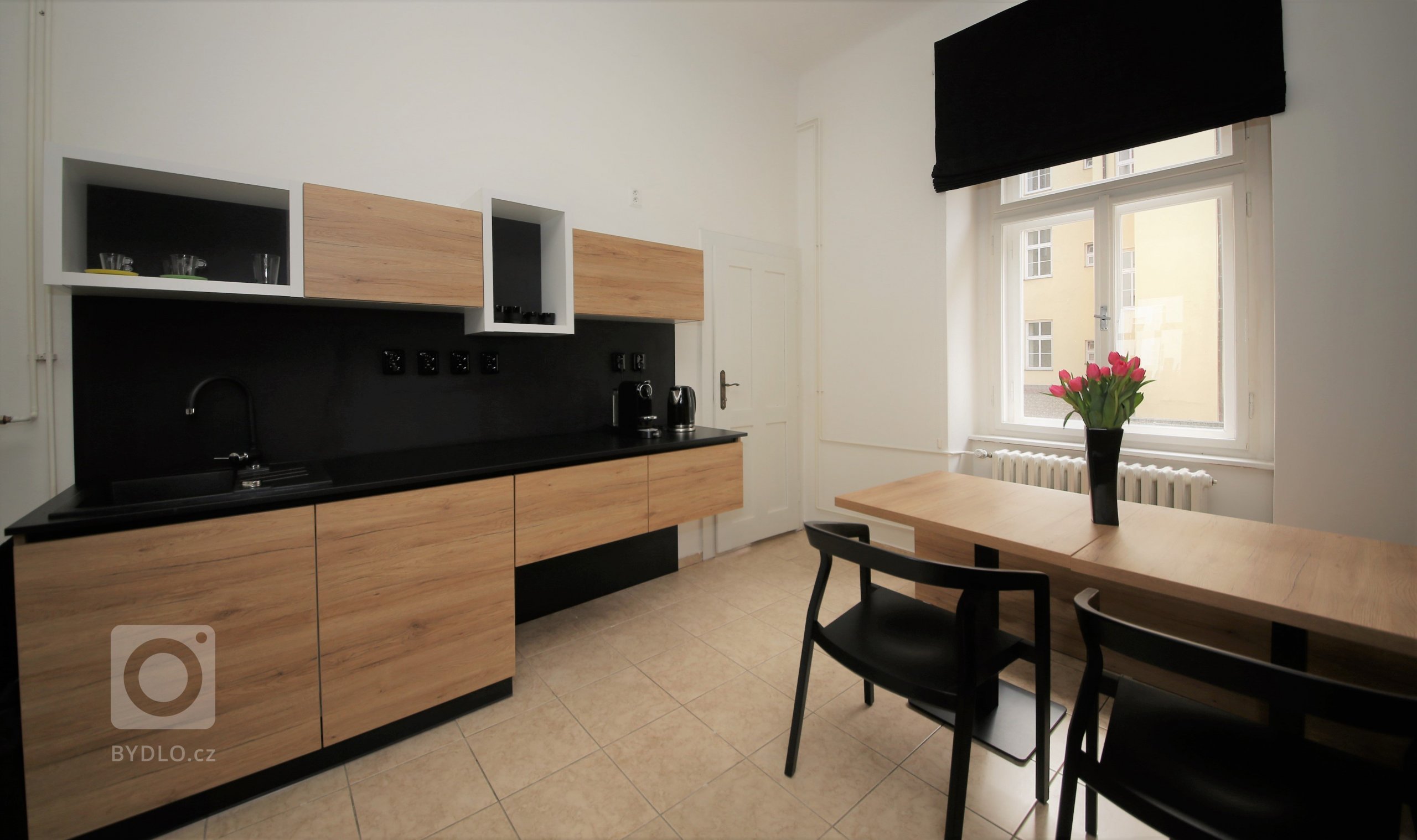 Chtěli jsme, aby kuchyňská linka na první pohled neprozrazovala svou funkci. Zbavili jsme ji tedy typického tvaru a dřez a baterii oděli do černé.