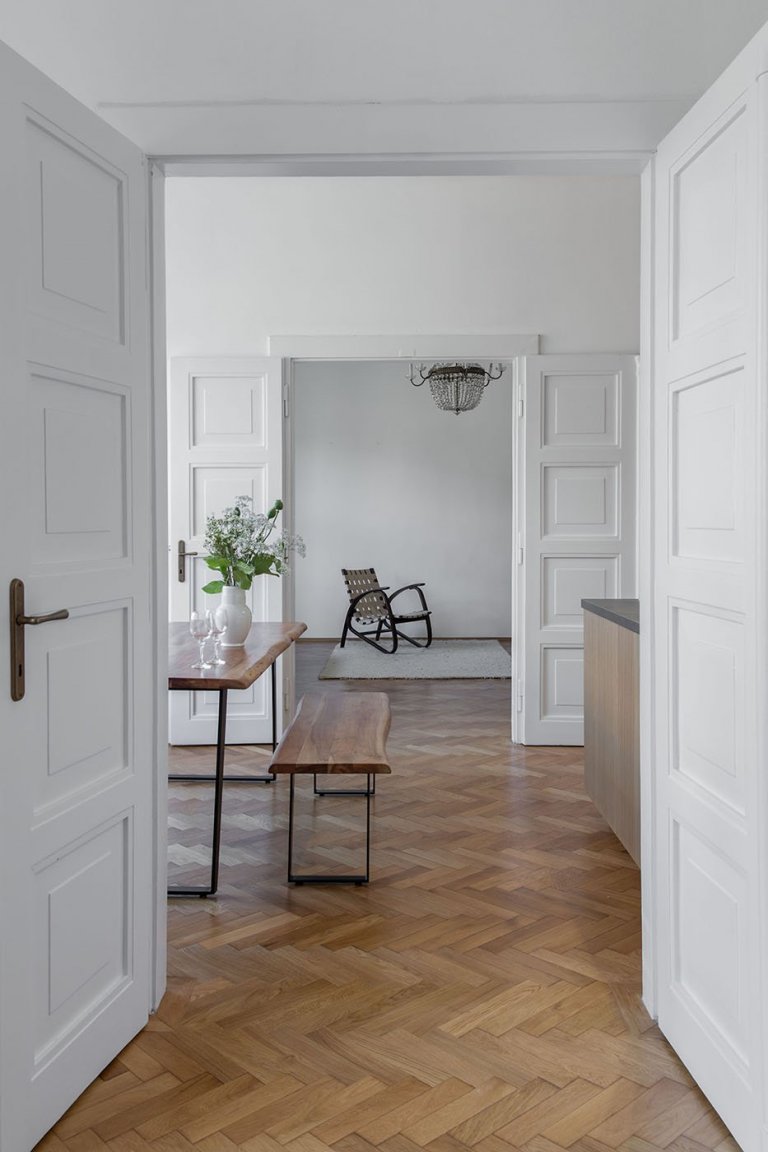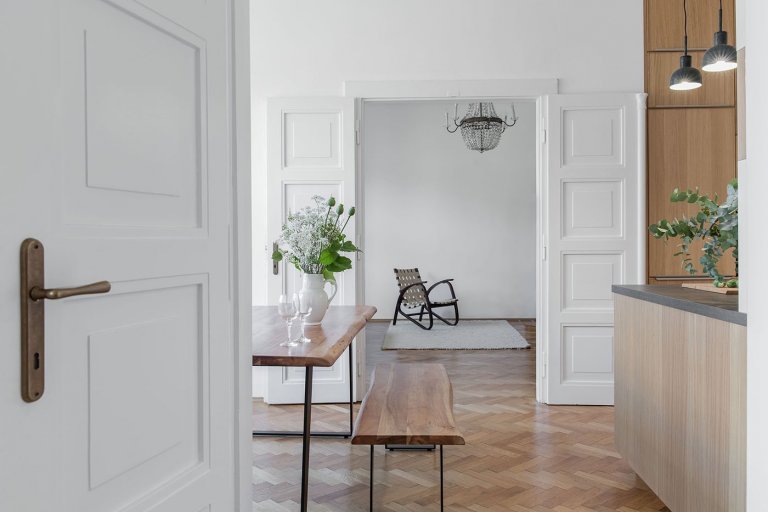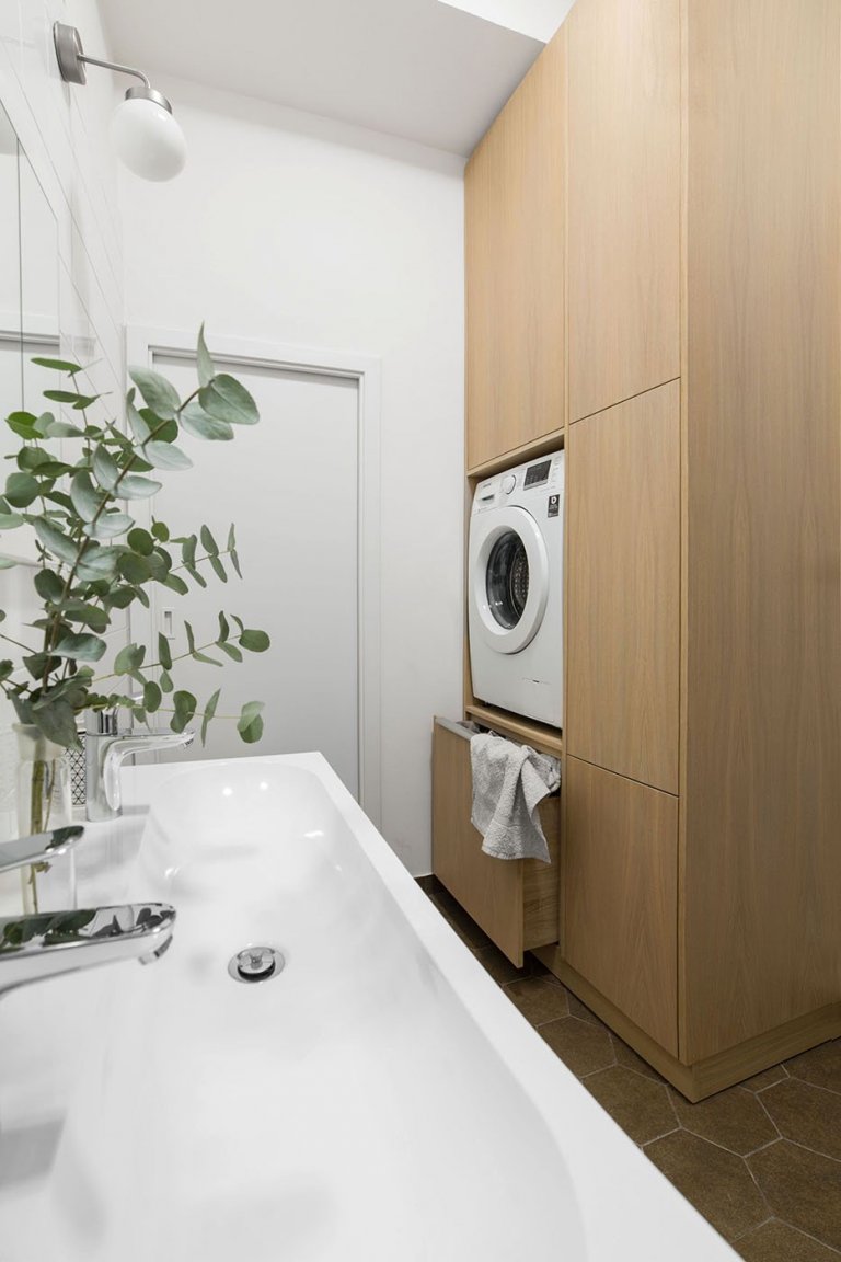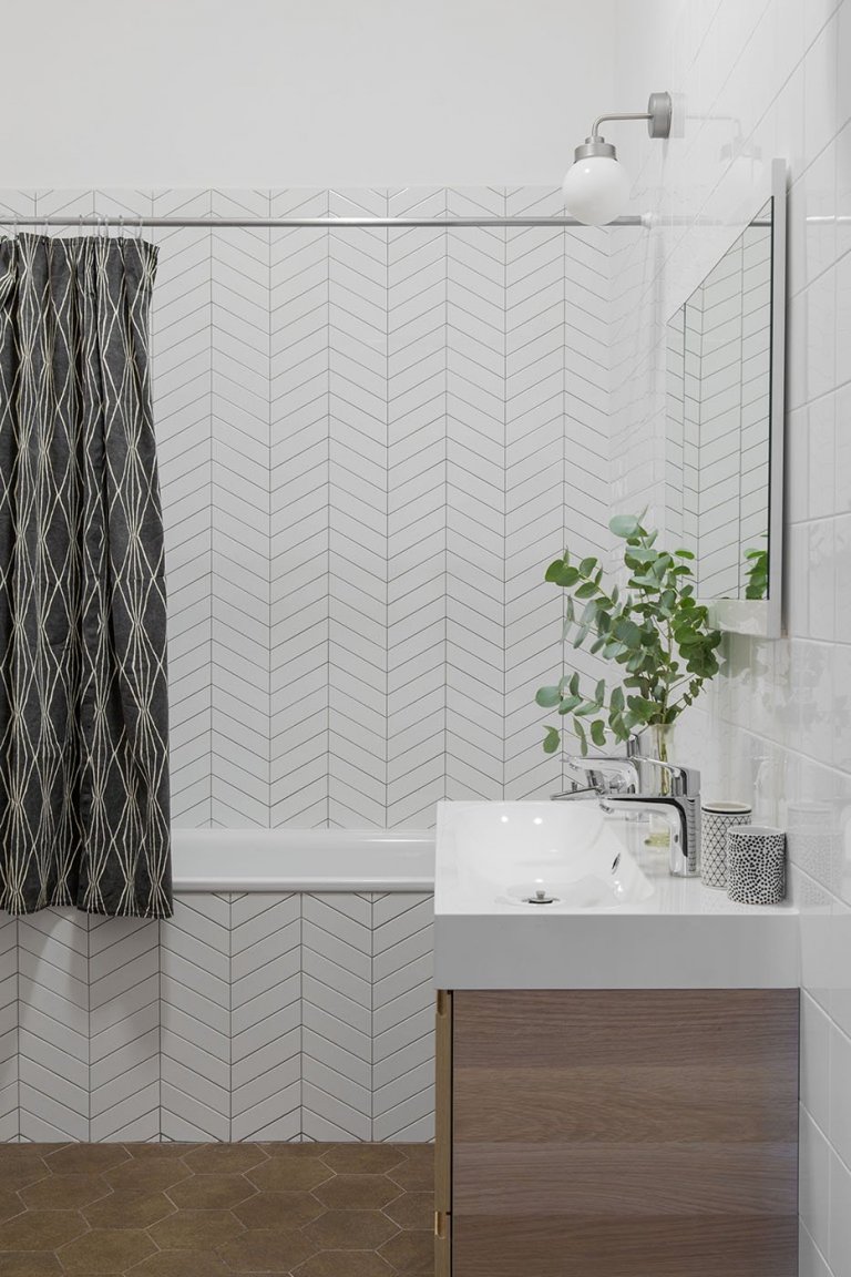 …koupelna nakonec zůstala v původním půdorysu, prostor v ní jsme získali chytrou změnou dispozice. V historických plánech jsme nalezli původní zazděný světlík, do ktrého jsme koupelnu odvětrali. Přidání sprchového koutu nakonec majitelé zhodnotili jako zbytečné.