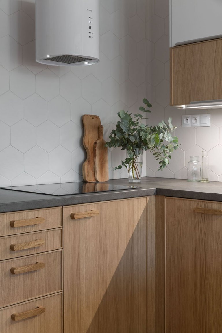 …posunutím dvou dveří dvou sousedních místností a vytvořením niky ve stěně do obýváku vznikla ze stísněné kuchyňky, kde nebylo nikdy na nic dost místa, prostorná moderní kuchyně.