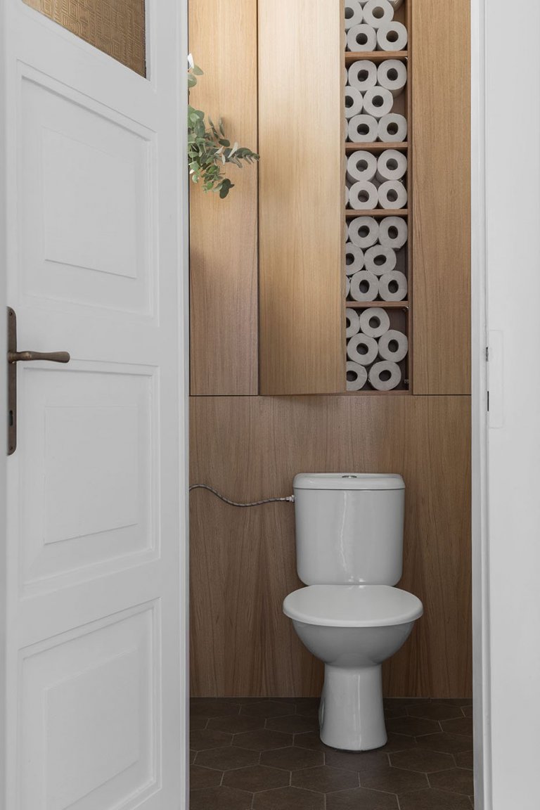 …úložné prostory za zadní stěnou WC, přivedení vody a přidání umývátka – kvůli mytí rukou se dříve muselo chodit přes ložnici až do koupelny. Samotné WC se majitelé nakonec rozhodli zachovat původní.