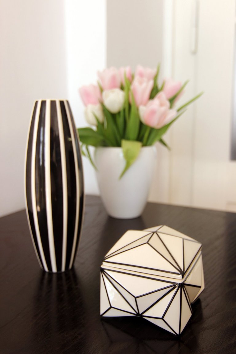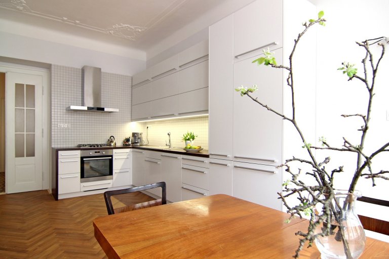 Nová kuchyňská linka je jednoduchá, bílá, s převahou horizontálních linií. Spolu se světlounce šedým odstínem výmalby tvoří decentní pozadí pro dominantu místnosti – původní strop. To, co se původně zdálo jako fatální nedostatek – doslouživší elektrické vedení k vývodu pro lustr ve středu místnosti, které ale kvůli zachování štuků nebylo možné ho vyměnit – dalo vzniknout originálnímu řešení, osvětlení stropu zespoda ve čtyřech rozích místnosti. Přes den krásné štuky se tak večer stávají přímo magickými.