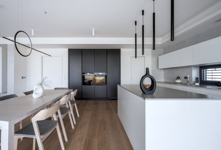 Čeho si u této kuchyně všimnete na první pohled, je bílo černý rytmus. Jako luxusní šachové plátno, ve kterém se střídají bílá a tmavá pole. Nebo jako elegantní klávesy na koncertním křídle. Přesně tenhle dojem designéři i majitelé chtěli vyvolat. Kuchyně, která vám nikdy nezevšední a pokaždé vás překvapí novým nápaditým tahem. Je příjemné zde trávit dny a prožívat noci. Na vše je připravena.