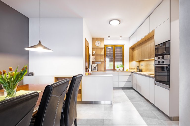Osvětlená pracovní plocha je základ. Nejen, že světlo splňuje praktický účel, ještě i dobře vypadá a vytváří v místnosti útulnou atmosféru. V této kuchyni je vyřešené úchytkovou lištou, ve které je integrované LED osvětlení.