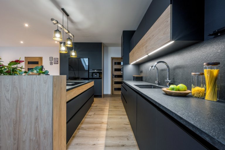 Začalo se ladit a přizpůsobovat na míru. Speciální prostor se zkosenými stěnami, místnost kombinovaná s obývací halou, tmavá barva jako colorizace vybočující ze standardu, dvouúrovňová sestava kopírující boční zeď. Finální volba padla na provedení TOP s vodorovnými liniemi vyrýsovanými z pracovní žulové desky Nero Zimbabwe v černém matu a se štípanou hranou. Jde o přímočarou definici moderního, charismatického designu, který nenechá žádný prostor bezdušně prázdný - místo toho všechny kouty zaplaví silnou přítomností a vybarví až mystickou vizualitou.