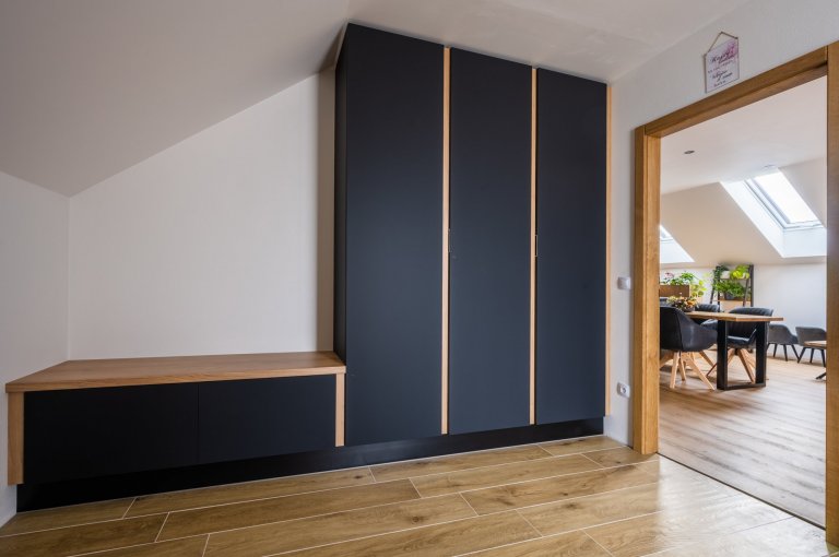 V sestavě dotažené do detailu nechybí ani spousta výjimečného úložného místa. Skryté zásuvky, výsuvné šuplíky nebo kaskádovitou potravinovou skříň tu doplňuje i prosklená vitrína na láhve s podsvícením - už tak živoucí kuchyně se tím rozzáří ještě o úroveň výš. Výsledné řešení bylo pro majitele natolik uspokojující, že si u Sykory nechali následně udělat i skříně do ložnice nebo chodeb.