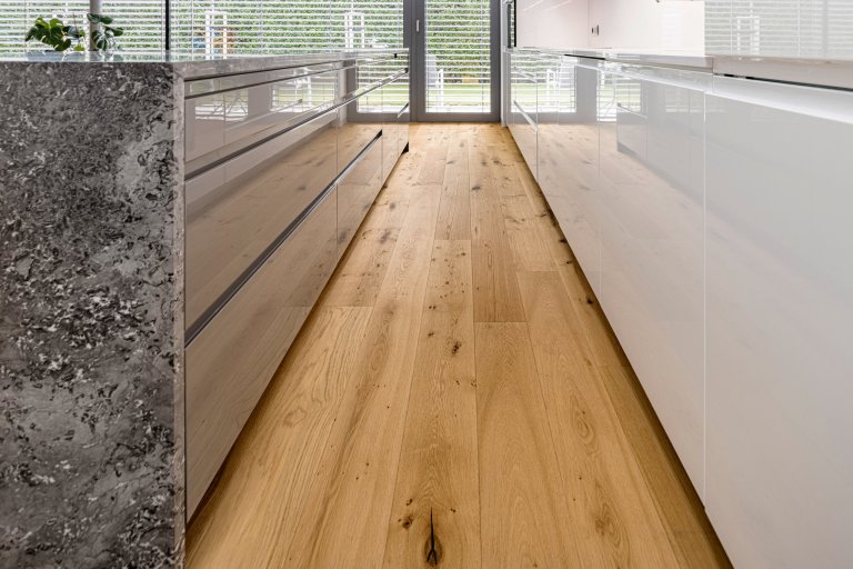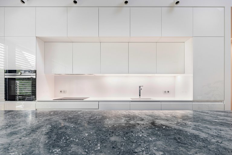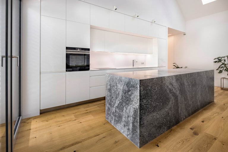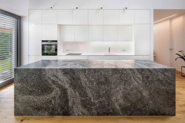 Ostrůvek přímo uprostřed, zachycuje oko přímo od dveří. Je plný výsuvů a skrytého úložného prostoru. Jeho povrch tvoří přírodní kámen Donatello, který je také potažen na bočních stěnách a plynule navazuje na zem. Deska je vyrobena z technického kamene, který je velmi odolný, trvanlivý a nemusíte se bát dát na něj i horký hrnec. Majitelé ji chtěli na vyšší úrovni, než je obvyklý standard. To lépe vyhovuje jejich potřebám a všichni členové domácnosti ji mohou pohodlně používat.