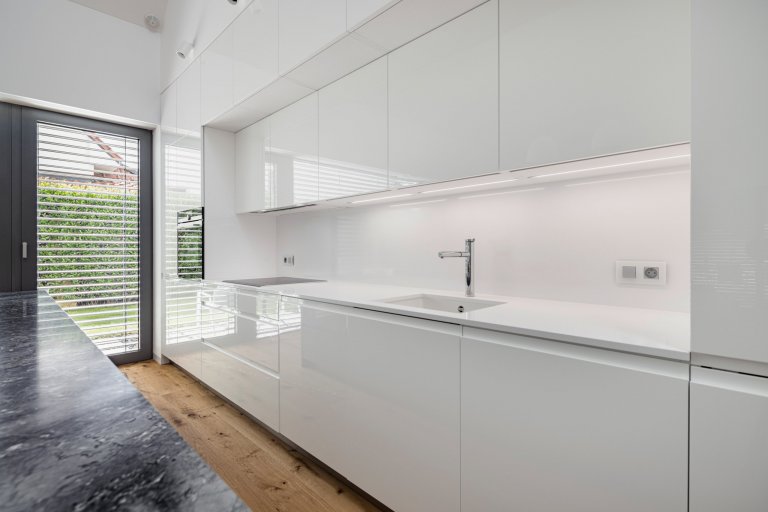 Jak to dopadne, když návrhářka sama navrhne kuchyni? Když má za sebou spoustu realizací pro zákazníky, má z první ruky přehled o materiálech, barevných provedeních a přesně ví, co chce a co ne? Rozhodujícím prvkem zde byla zejména dokonalá ergonomie. Věci mají své jasné místo, což je logické a praktické, neděláte žádné další kroky, máte vše po ruce přesně tam, kde to potřebujete. Ani volba designu nebyla náhodná. Celý dům je koncipován do tří prvků – bílá, šedá, dřevěná. Bílé skříňky ve vysokém lesku provzdušňují již tak velkorysý prostor, který tak vypadá otevřený a čistý. Ostrůvek v šedé barvě decentně rozbíjí bílou a v kombinaci s dřevěnými podlahami vytváří příjemnou domáckou atmosféru.