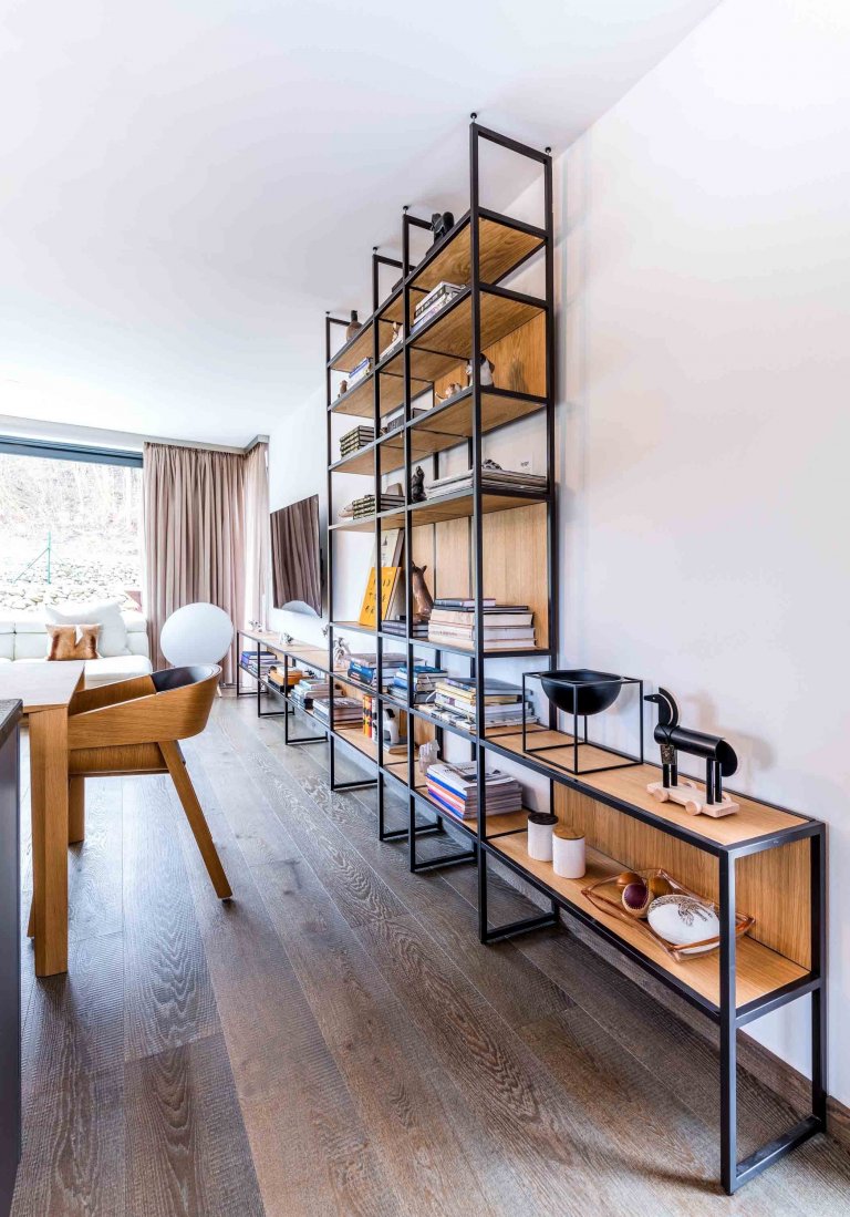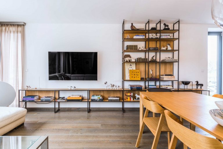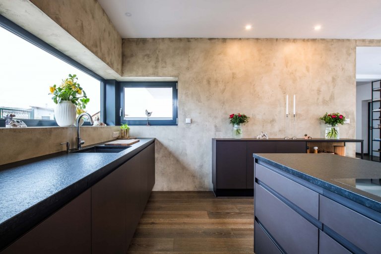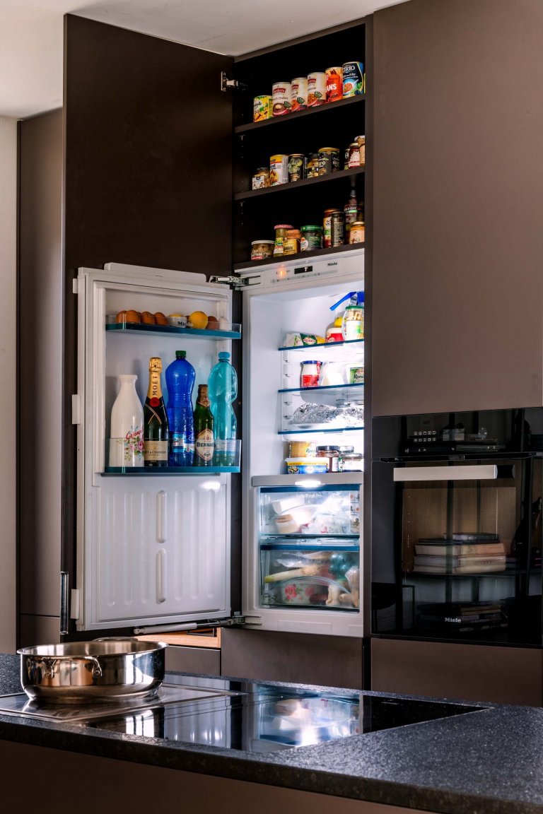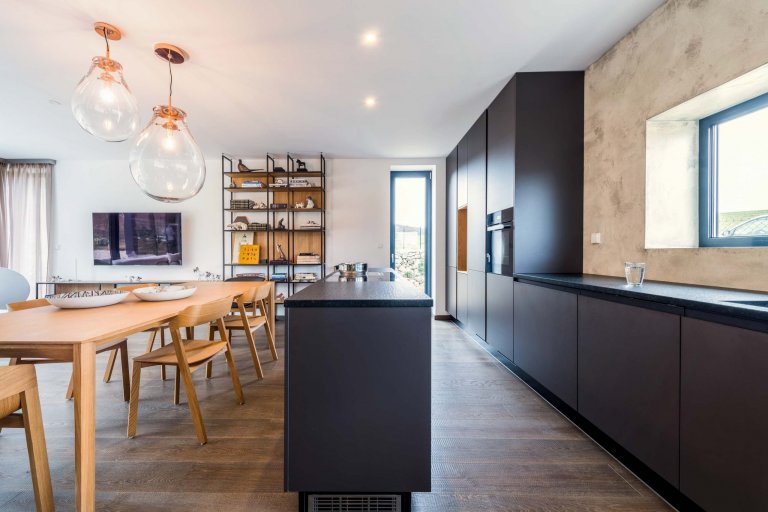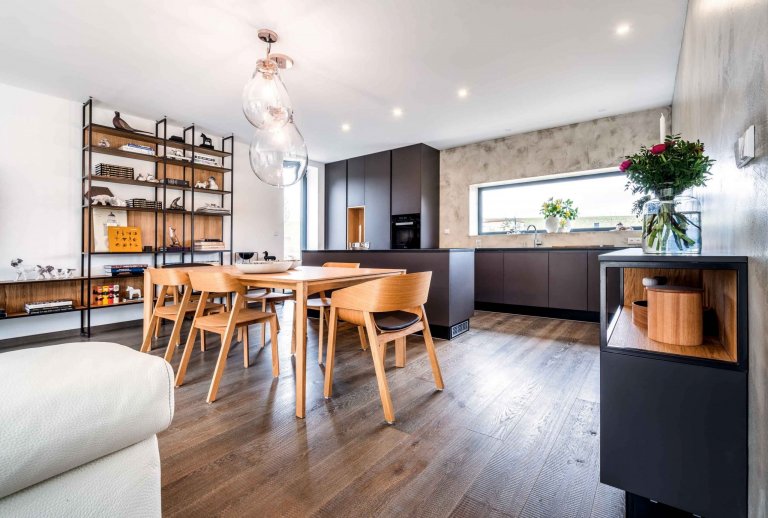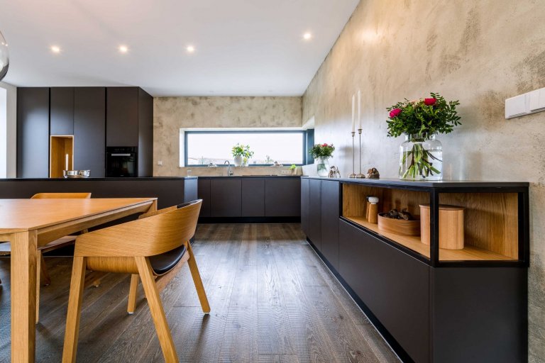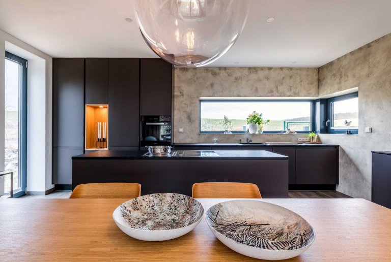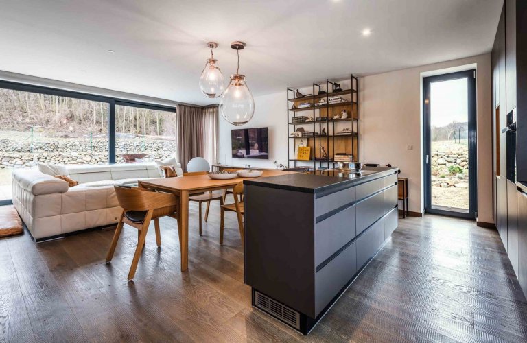 Překrásná kuchyň, kde jsou využity nejnovější materiály a funkce, kladoucí důraz na ergonomii. V této kuchyni je efektivně využitý prostor, zvolené skříňky mají funkci úložného prostoru a slouží zároveň jako dekorace. Velkým oživením je průhled do přírody, který navozuje pocit klidu a harmonie. Kuchyň je vyrobená z kvalitního a pevného materiálu Evermatt Terrabrown, který má vysokou odolnost proti vnějšímu působení, poškrábání, otiskům prstů a drží si svou barevnou stálost. Úchytky jsou černé top. Pracovní deska vyrobená z žuly Nero Zimbabwe má punc luxusu a výjimečnosti. Tvoří dominantu kuchyně a upoutá každou návštěvu. Navíc má vysokou odolnost proti otěru a poškrábání, která umožňuje na sobě krájet či klepat maso. Odolá vysokým teplotám a je snadno udržovatelná. Varné centrum má zajímavou vychytávku a to integrovaný odsavač do varné desky s tepanem. Vaření na tepanu patří ke kulinářským zážitkům moderní kuchyně. Pokrmy se přitom připravují přímo na horké nerezové desce. Odsavač zabudovaný do varné desky odsává výpary ihned tam, kde vznikají. Nádherným doplňkem tmavé kuchyně je dřevo. Kuchyň je propojená s obývacím pokojem a obě tyto místnosti právě dřevo propojuje a vkládá jim duši. Přírodní materiál celý prostor oživí a prosvětlí. Police v obývacím pokoji z Dubu antického tmavého jsou vzdušné, v novém moderním designu, zabírají minimum místa a přitom dobře plní svoji funkci. Tento detail se objevuje i v kuchyňské lince, kde je použitá otevřená skříňka s konstrukcí a dýhou.