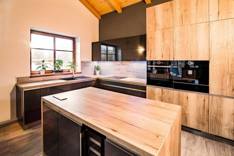 Zajímavá kombinace černé se světlejším dřevem. Černá dodává kuchyni elegantnost a styl, dřevo útulnost a teplo domova. Společně se tyto materiály doplňují a představují atraktivní a vkusnou variantu moderní kuchyně.