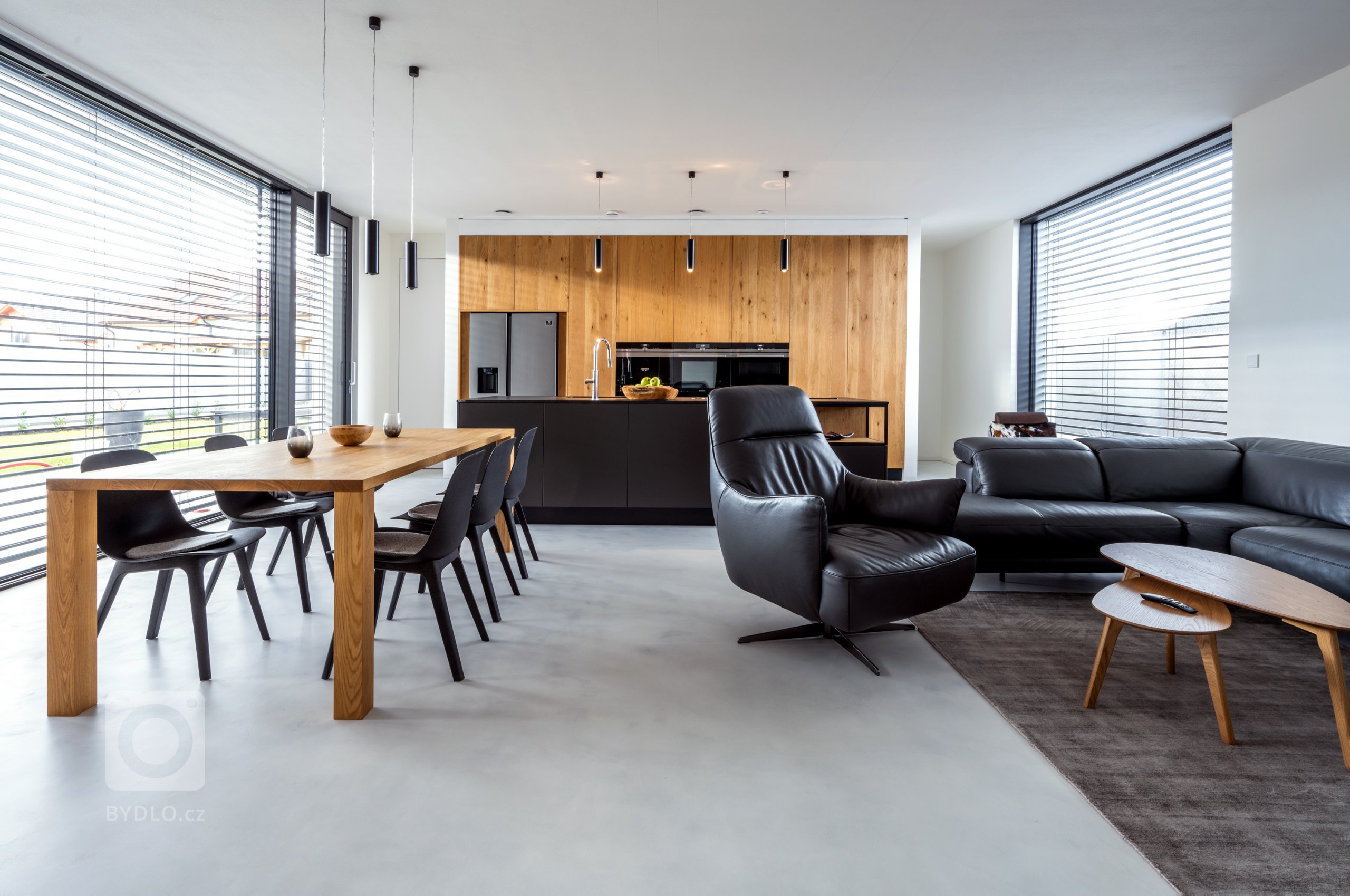 Multifunkční prostor místnosti zahrnuje jak kuchyni a jídelní část, tak obývací prostor. Materiálové propojení proto bylo extrémně důležité - při přechodu z jednoho rohu do druhého bylo potřeba zachovat stejnou energii a vizuální jiskru.