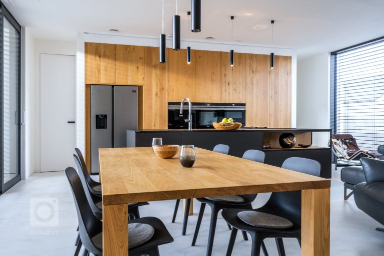 Pro robustní, vysoké skříně byla zvolena dýha Dub Sukatý - při vstupu do haly na ní okamžitě ulpí oči, na rozdíl od prstů, jejichž otisky na dvířcích nikdy nezůstanou. Právě chytrá řešení jsou v téhle sestavě všudypřítomná, což se nedá říct o vypínačích, jež tu naopak zcela chybí. Osvětlení se ovládá buď přes mobil, nebo se automaticky zapíná podle množství světla, které zrovna přichází bočními celoskleněnými stěnami.