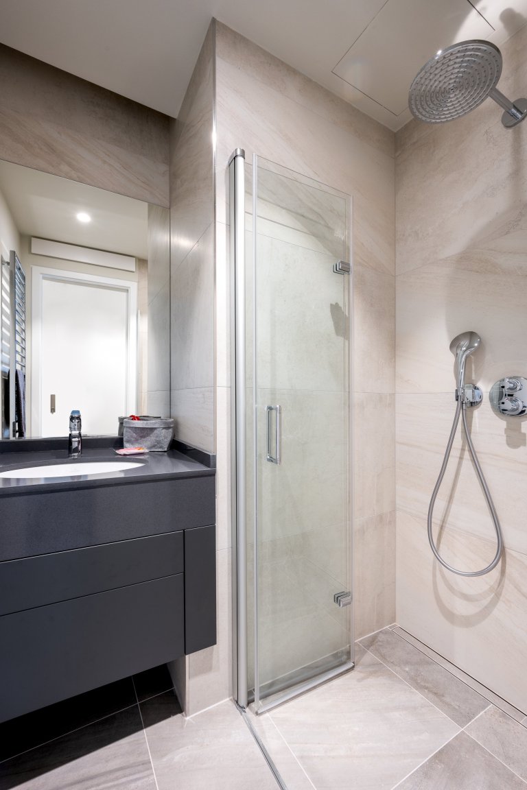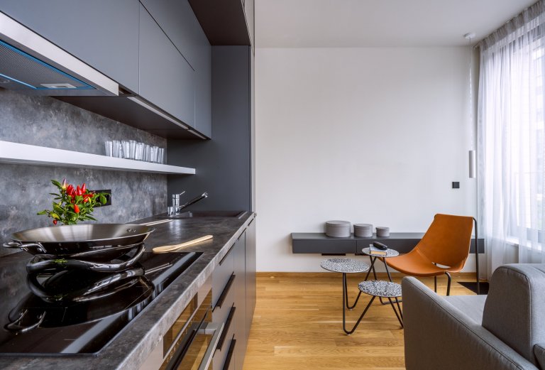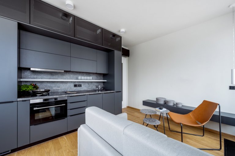 Hlavní prostor bytu, zamýšleného k nájemnímu bydlení, patří kuchyni propojené s obývací částí. Pro kuchyňskou sestavu byla vybrána tmavá antracitová barva - nevšední pro oko a zároveň komfortní pro každodenní užívání. Povrch dvířek jsme nalakovali matným Evermattem, který dveře chrání před otisky prstů. Lakovaná je rovněž středová police v barvě Light Grey. Pracovní deska a obklad jsou z vysokotlakého laminátu v provedení Brown Marble.