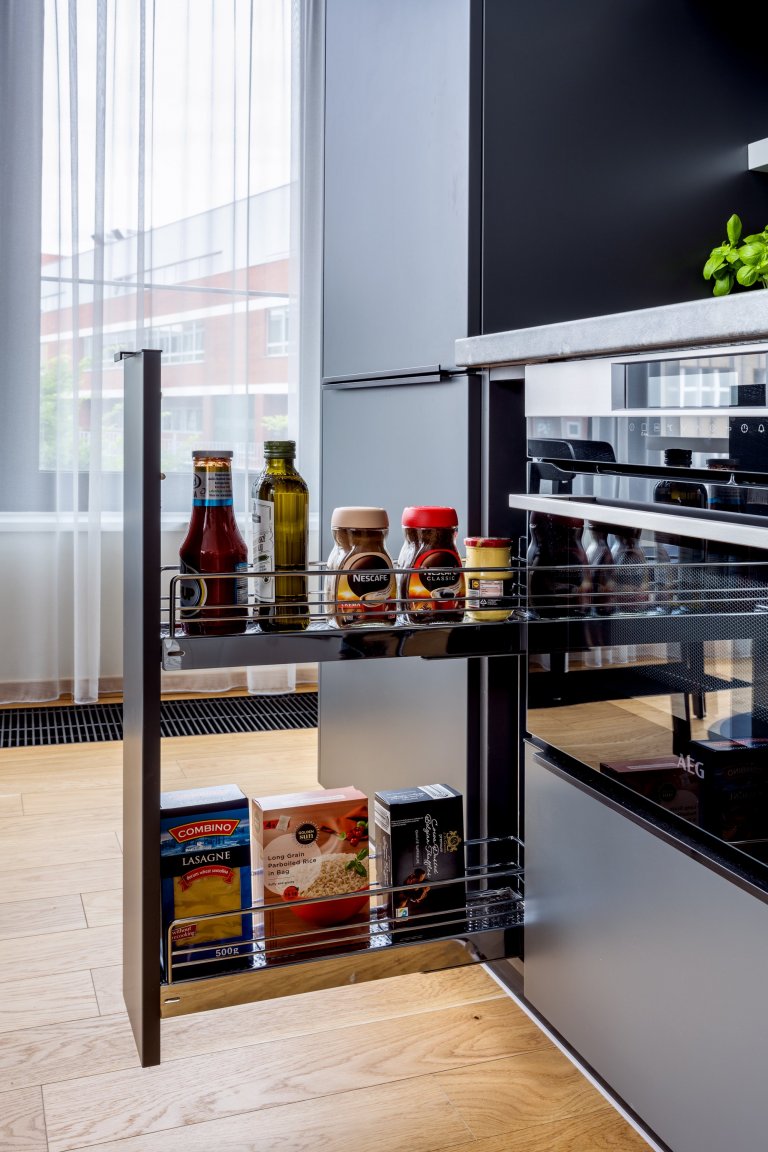 Kuchyně je promyšleně osázená spotřebiči značky AEG - například horkovzdušná trouba je menších rozměrů, takže se vedle ní vešla i vertikální skříňka s výsuvem. Potřebné suroviny jsou tak při vaření hned po ruce. Nad varnou zónou je umístěn výsuvný odsavač. Ještě nad ním se nachází horní box speciálně designovaný na drobné předměty a ingredience - jako kořenky, dózy nebo čaje. Na opačném pólu, nad mycím centrem, našla své místo další vychytávka. Horní skříňka obsahuje moderní okapový systém. Oceníte ho pokaždé, když se vám nechce čekat, až myčka dokončí mytí vašeho oblíbeného šálku na kávu. Z boků sestavu rámují lednice s mrazákem a  vysoká potravinová skříň s nastavitelnými policemi.