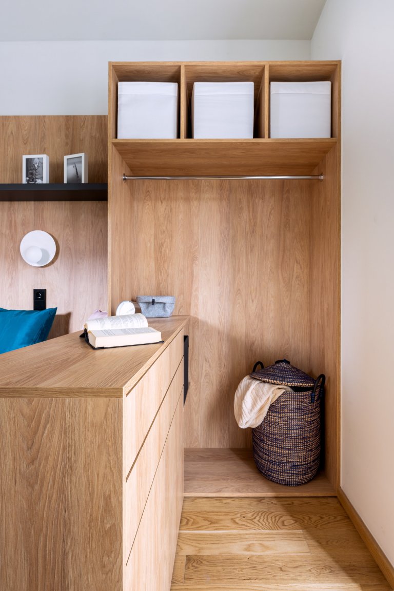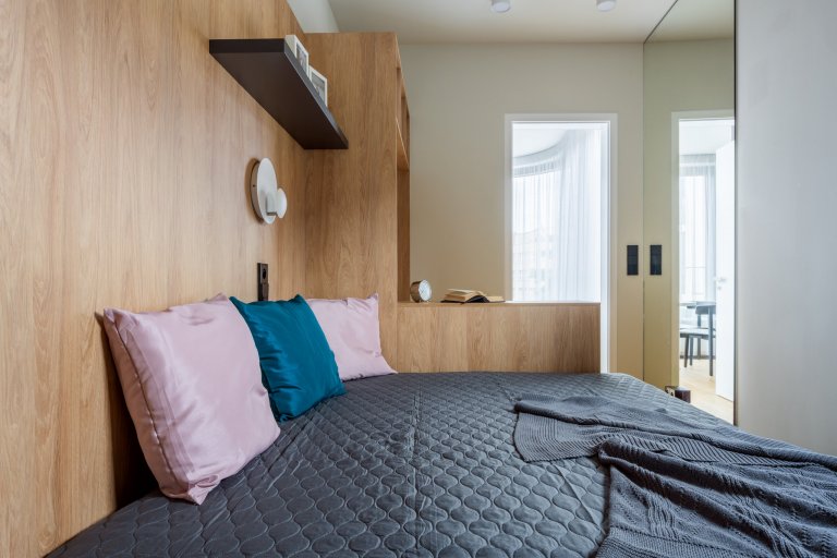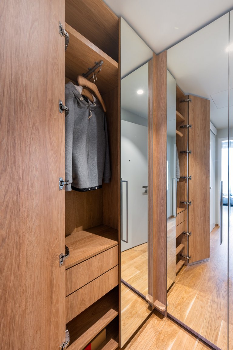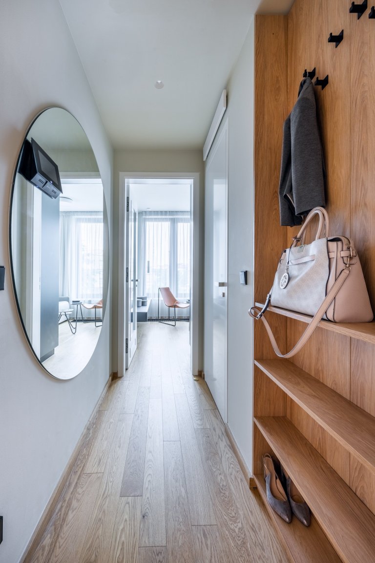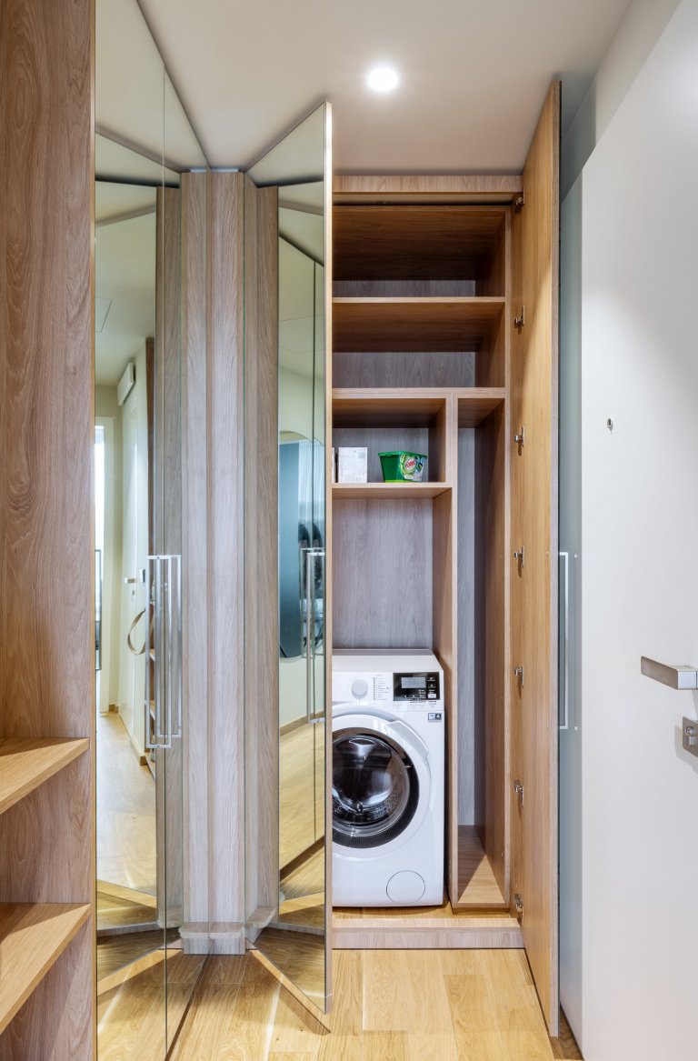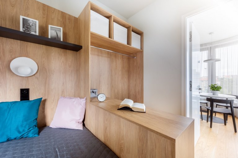 První, čeho si při vstupu všimnete je to, jak velkoryse byt i přes své malé rozměry působí. U vstupu jsme totiž instalovali skříně se zrcadlovými dveřmi Alfa - jedny jsou klasicky rovné, druhé okrouhlé. Dohromady interiér opticky zvětšují a dodávají mu na vzdušnosti. Vnitřní část první skříně slouží jako úklidová komora s vestavěnou pračkou - díky chytrému plánování v ní zbyl dostatek místa i na žehlící prkno a prací prostředky. Druhá zrcadlová skříň je určena na oblečení. Hned vedle ji doplňuje otevřený odkládací prostor s věšákovým systémem na kabelky nebo saka. Pohodlí zaručeno. Kromě praktického využití má toto řešení také designový smysl: zakrývá nevzhledné rozvody. Dalším funkčním detailem je zarážka dveří, která brání rozbití zrcadel o úchytku.