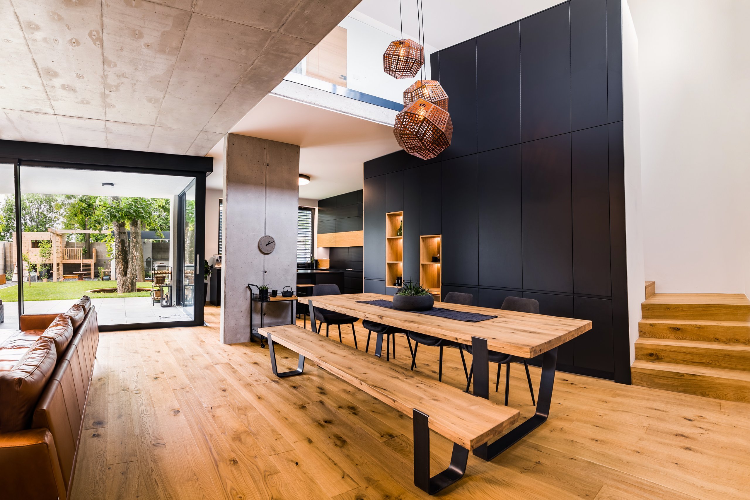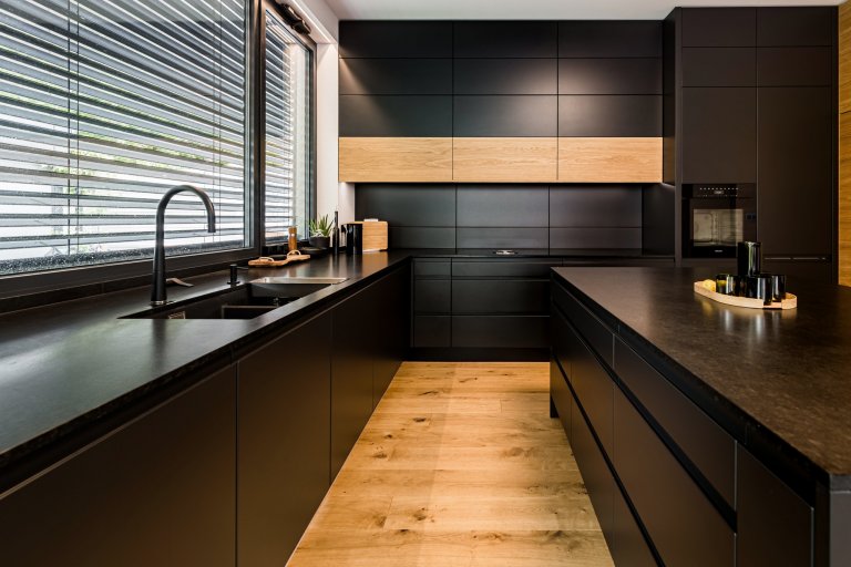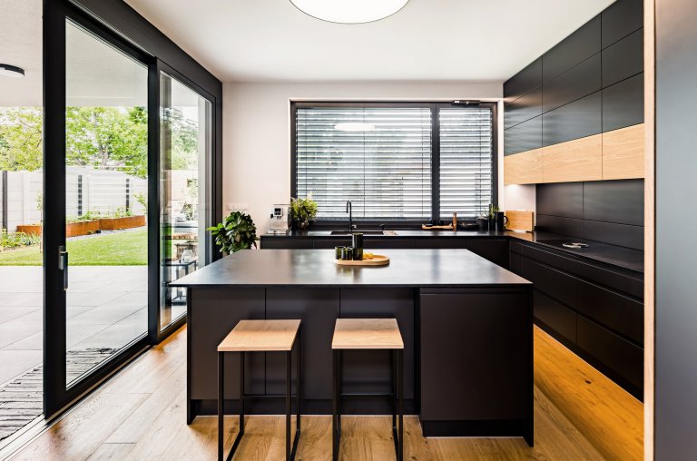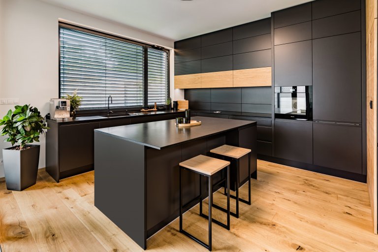 Otevřená kuchyně plynule navazuje na jídení část. Provedení dřeva v kombinaci s antracitovou barvou pozitivně působí na všechny smysly. Nahlédněte do ní.