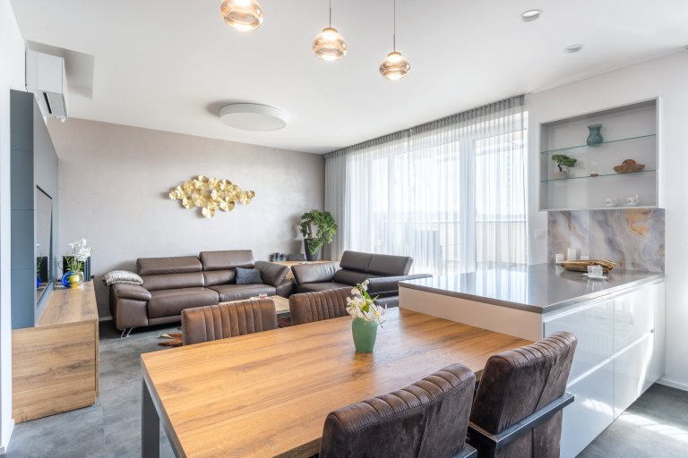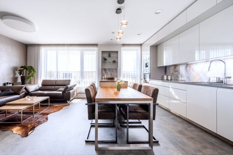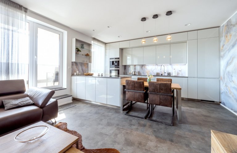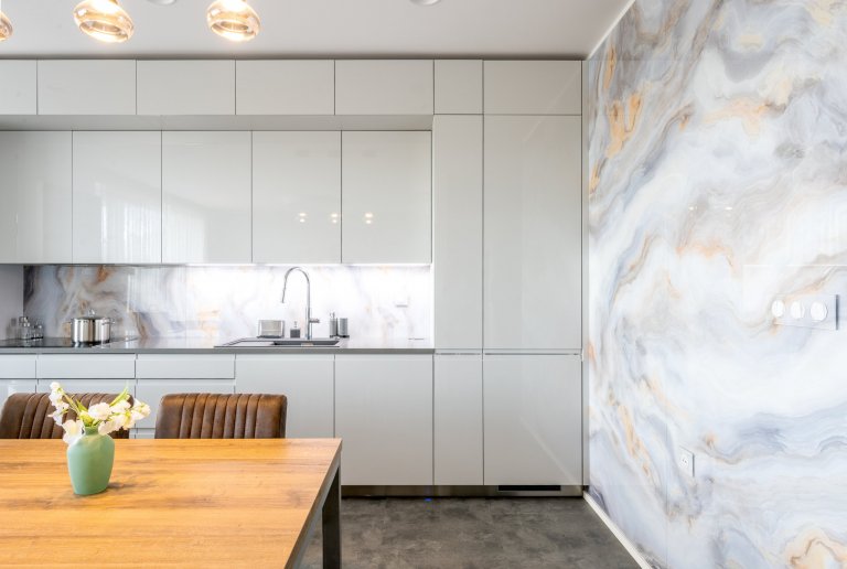 Nejvýraznějšími designovými prvky této kuchyně jsou obkladové zástěny ze skla Onyx. Tvoří boční obložení nad mycí a varnou zónou a pokrývají i celou jednu stěnu místnosti. Jejich mramorově nebeský půvab je podpořen triem zlatavě zářivých, ovšem decentních lustrů, a perfektně dotváří atmosféru místa - tady se žije naplno.