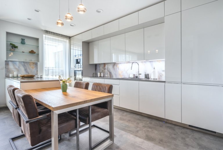 Sestava samotná využívá symetrii horních a dolních skříněk v provedení Light Grey. Bílé, leskle lakované plochy dvířek jsou okouzlující na pohled i vhodné na každodenní provoz. Ve spojení se zástěnami působí vzdušně a přidávají prostoru na velikosti. Zafrézované úchytky Pure už tak nepřehlédnutelnou hladkost a čistotu linií ještě vyzdvihují.