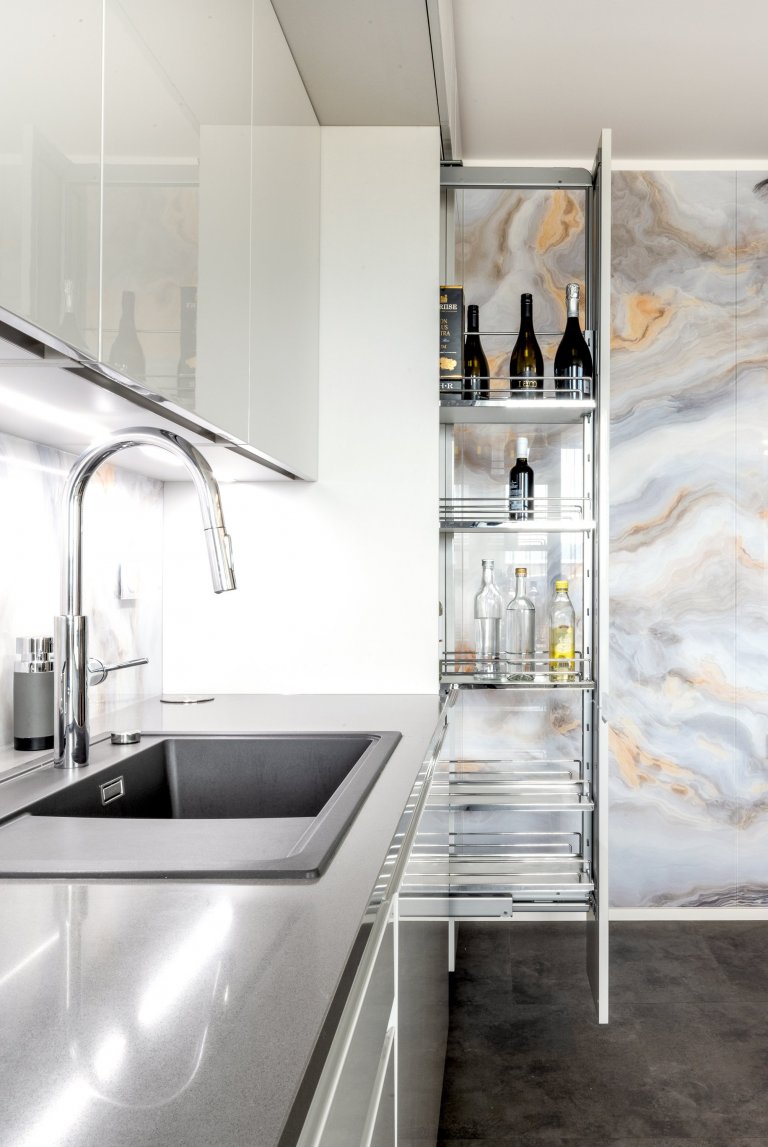 Nápaditě a všestranně jsou řešeny i boky sestavy. Vlevo vedle spotřebičové věže s troubou a kávovarem Siemens jsme vzniklý prostor osadili úzkou vysokou skříní, kam si majitel ukládá jinak neskladné věci jako mop nebo žehlící prkno. Na opačném pólu, vedle lednice, objevíte výsuvnou potravinovou skříň. Skvěle dostupná, poskytuje perfektní přehled a vejdou se do ní i vysoké láhve. Třeba od šampaňského šampionů.