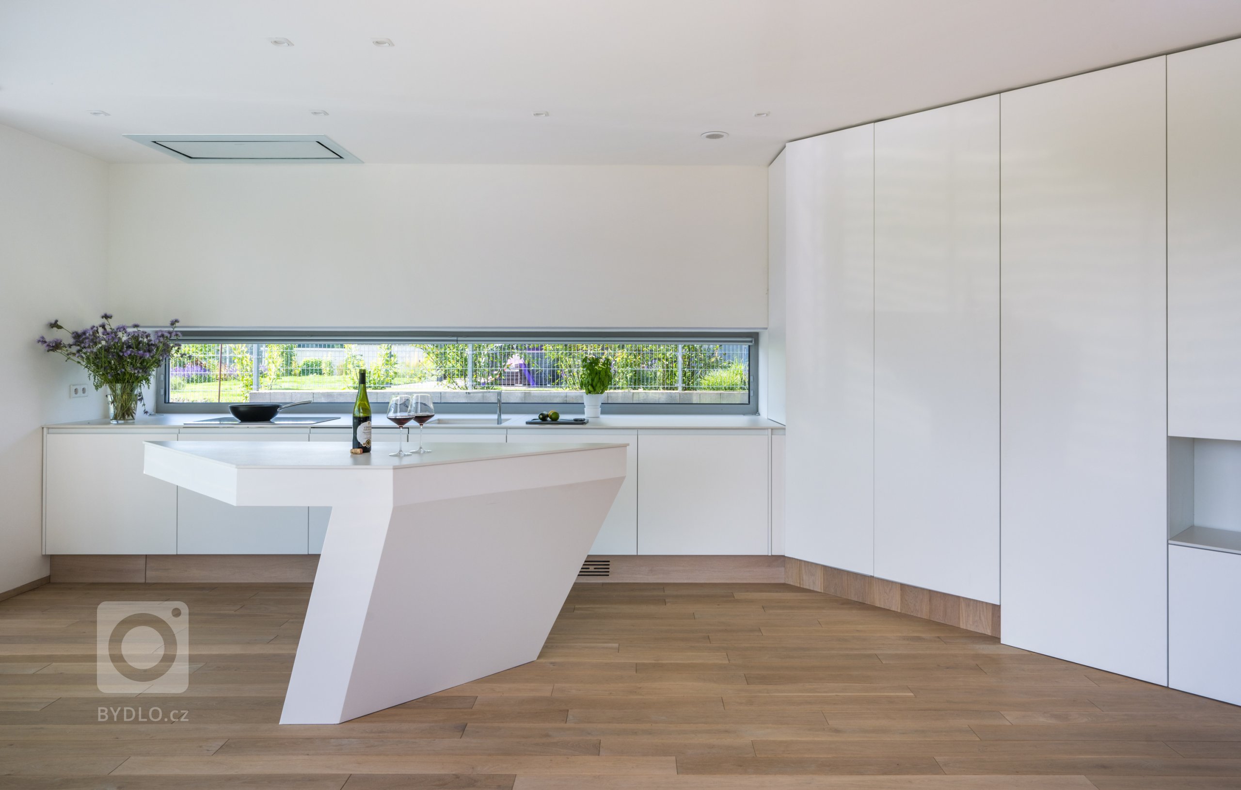 Atypické je zde všechno. Od ostrůvku z polystonu, který kopíruje půdorys samotného domu, je zapuštěný do základů a působí jako záchytný středobod, odkud dirigujete veškeré dění kolem.