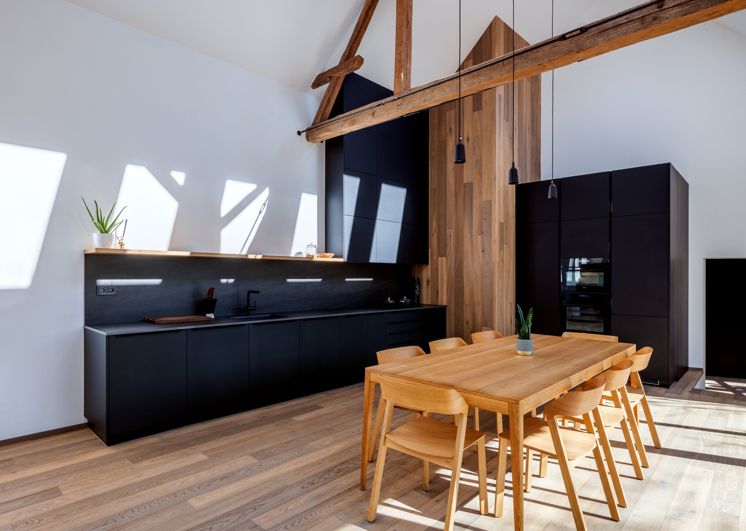 Základ kuchyně tvoří dva korpusy v provedení Xtreme v černém matu, které v rohu odděluje dřevěný masivní sloup s traverzou. U delší zdi, naproti prosklenému průhledu do zahrady, se nachází mycí a přípravná zóna s efektním designovým řešením vysokých skříní, které stylistikou připomínají kapitánský můstek. Protažené až do stropu vzdušnou místnost elegantně ukotvují a zároveň z ní vyčnívají jak prostorově, tak esteticky. Z praktických důvodů jsou bez úchytek, s dotykovým otevíráním Tip On.