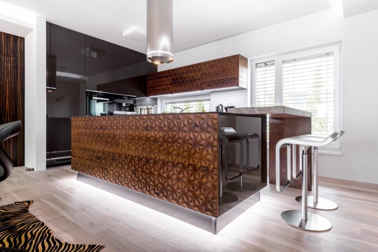 Průmyslová revoluce v domácím podání. Luxusní modernistická kuchyně Diamond je jako otevřená kniha mimořádně uspokojivého životního stylu. Industriální prvky tu umně navazují na nadčasové technologie a naopak. Zabudované skříně i volně stojící solitéry využívají 3D profilovaná dvířka v provedení Diamond, polygonová dýha je doplněna dvířky vyleštěnými do vysokého lesku Antracit Gloss, který Sykora vyrábí jako jediný v Česku. Keramická pracovní deska Iron Corten v minimální tloušťce působivě imituje rezavý plech – kuchyně tím získává jak charisma, tak jedinečnost, nezaměníte ji za žádnou jinou. Zářivý charakter sestavy podtrhuje rovněž dolní podsvícení ostrůvku a stropní nerezový odsavač. Když se podíváte pozorně, všimnete si, že pracovní prostor je nápaditě a zároveň nenuceně rozšířen o boční barový pultík i s posezením. V této sestavě vždy najdete místo pro další výjimečný zážitek.