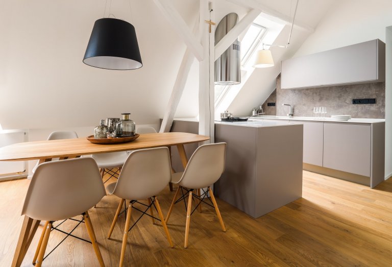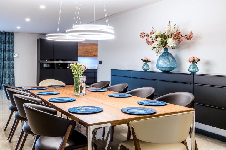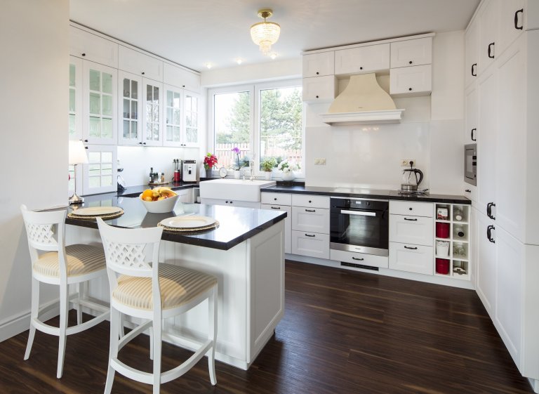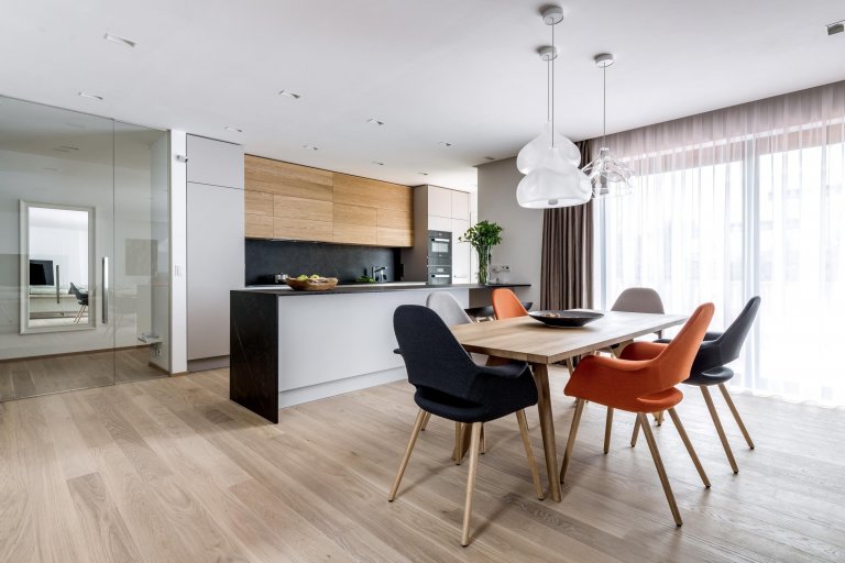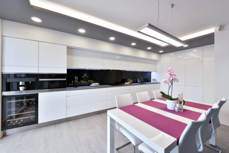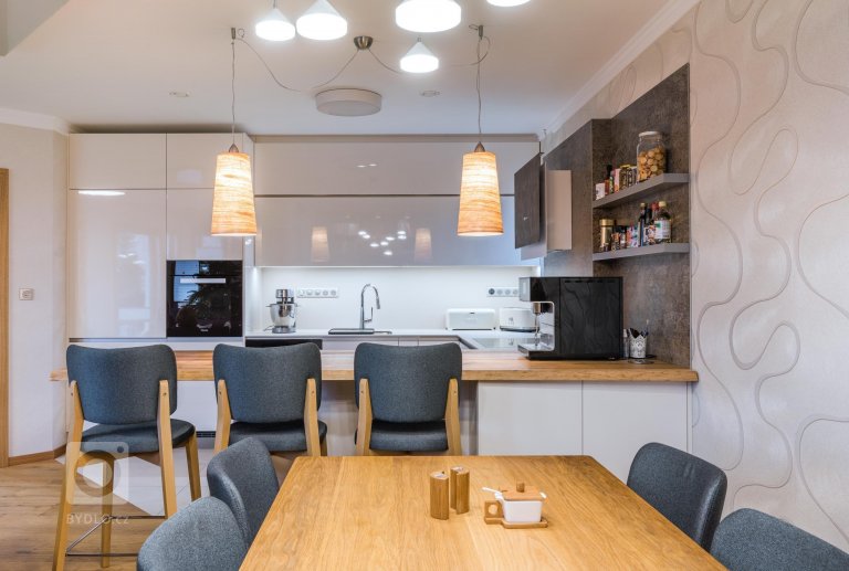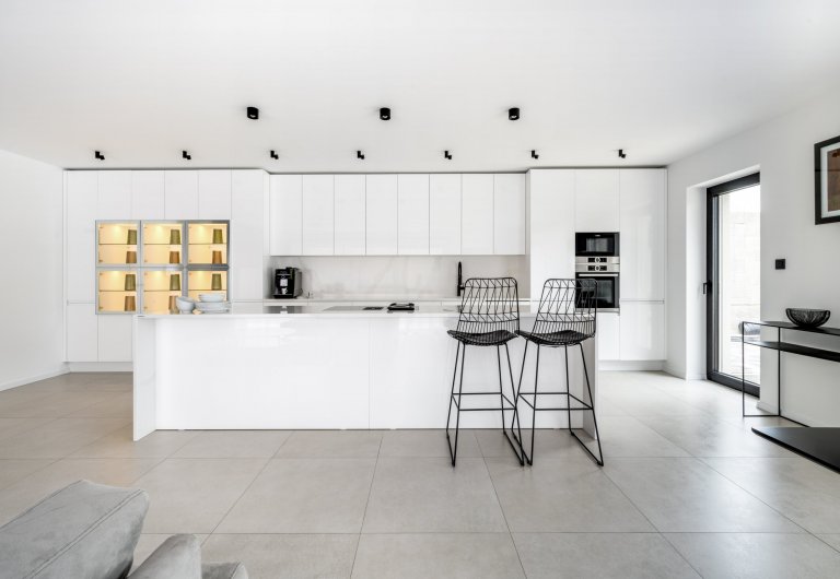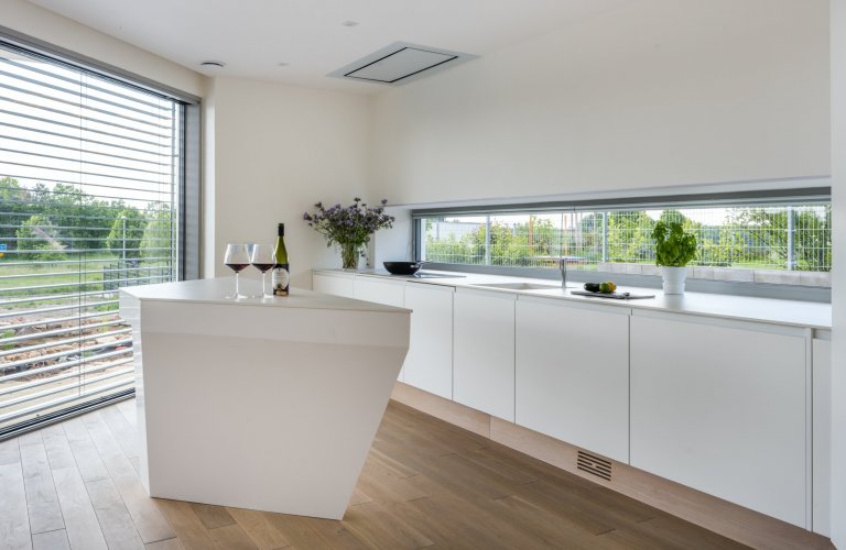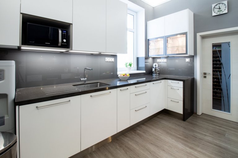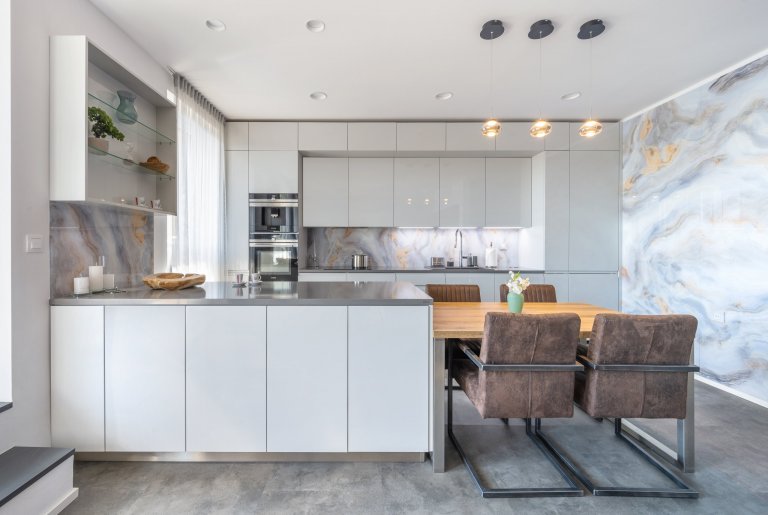 Kuchyňskou linku prosvětluje světlá pracovní deska z technického kamene TECHNISTONE NOBLE ARETI BIANCO. Charakteristické vlastnosti materiálu technistone je nenasákavost, neporéznost a vysoká odolnost kamene proti poškrábání a chemikáliím. Lesklý povrch dodává eleganci a dobře se udržuje. Kuchyně je prostorná, je zde dostatek úložného prostoru a velká pracovní plocha. Umístění elektrické trouby, parní trouby a kávovaru je pohodlně vedle sebe čímž jsou v příjemné výšce a dobře dostupné. Ve spodních rozích kuchyně jsou zabudované výsuvy LeMans, které mají praktické využití pro uložení hrnců a chytře využívají jinak špatně dostupné místa. Kuchyňský stůl umístěný v rozlehlé kuchyni je skvělou zónou pro sešlost s rodinnými příslušníky i přáteli. Skříňky v jídelně jsou ze stejného materiálu jako v kuchyni aby barevně i materiálově ladily a harmonicky doplňovaly celý interiér.