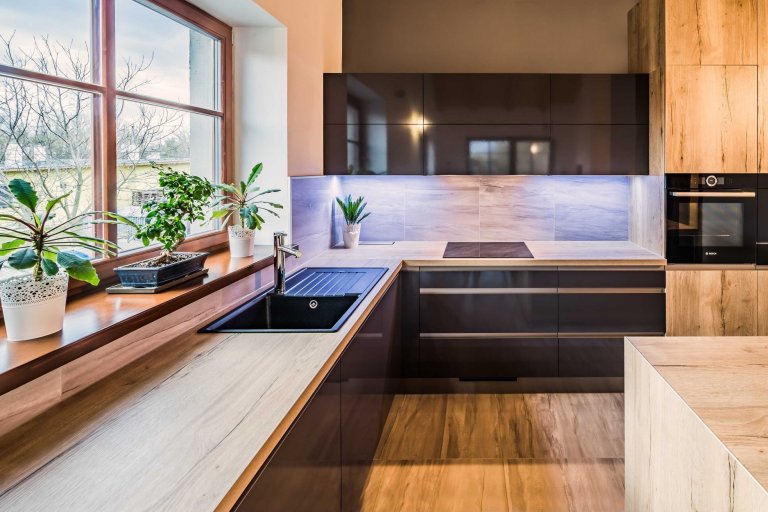 Mladá rodina, která se nemusí omezovat prostorem, si na první dojem zamilovala tuhle barevnou kombinaci. Skříňky jsou zvoleny z exkluzivního materiálu LAK EVERMATT BLACK, který je vysoce odolný proti opotřebení, poškrábání a otiskům prstů. Je taky velice příjemný na dotek a zachovává si svoji barevnou stálost. Zvolené úchytky na hranu jsou s takovou povrchovou úpravou, aby ladily a splývaly s barvou skříněk. K černé se úžasně hodí dřevo, proto jsou horní skříňky v designu DUB COGNAC. Po celé spodní délce těchto skříněk jsou namontované světla, které prosvítí celou pracovní plochu.