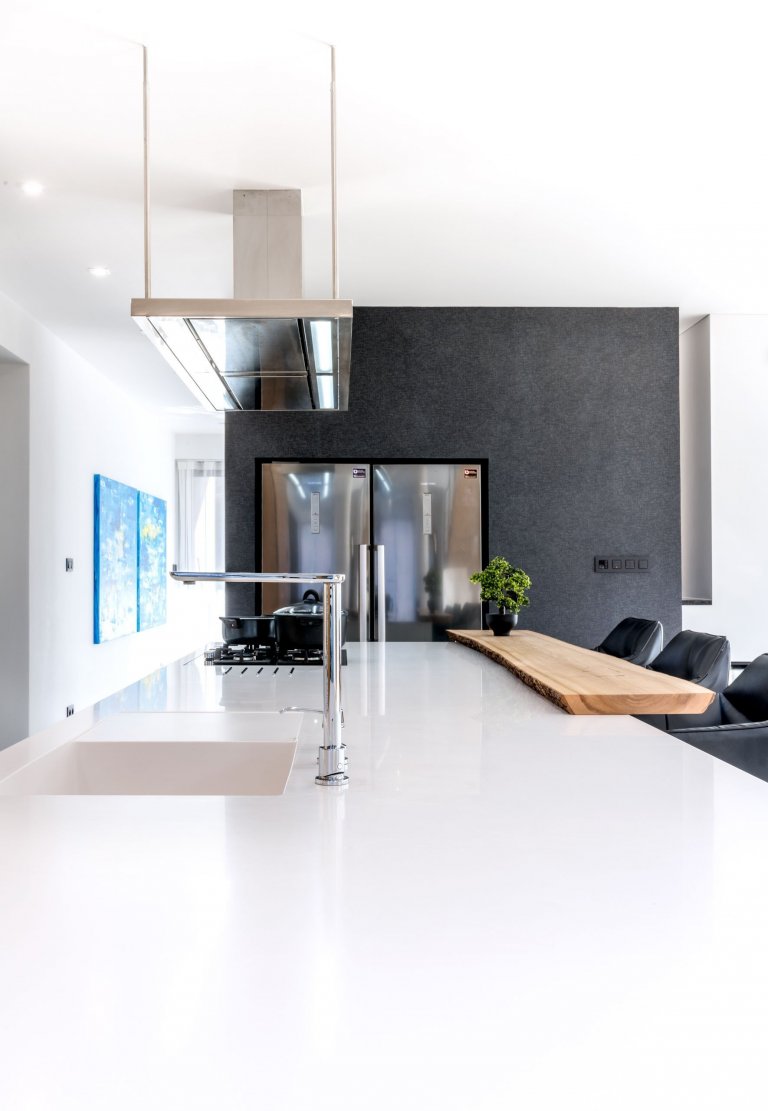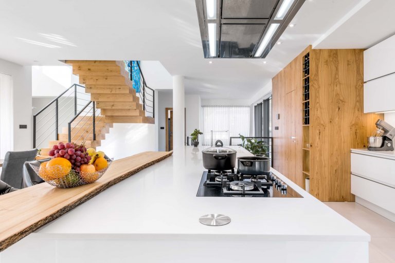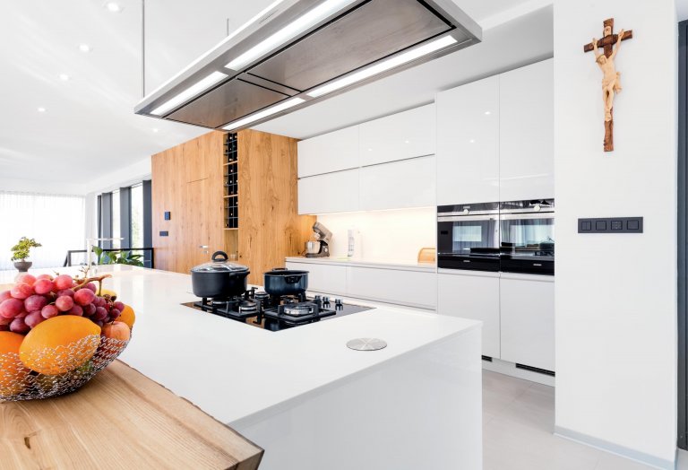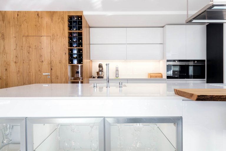 Stačí pohled na podsvícenou pracovní desku z umělého kamene a všichni ví, že tady se vyznává praktická krása. Vysoké skříně kombinující dřevo a bílý lak neokázale, ale o to efektněji připomínají, že kde je cit, nápaditost a elegance, tam má každý okamžik své trvalé kouzlo. A co teprve ten prodloužený ostrůvek propojující varnou část s jídelním stolem a jasanovým barem? Není třeba dalších slov a dojde nám, že v téhle kuchyni se věci dělají a prožívají společně. Když váš život stojí za to, vaše kuchyně je toho důkazem.
