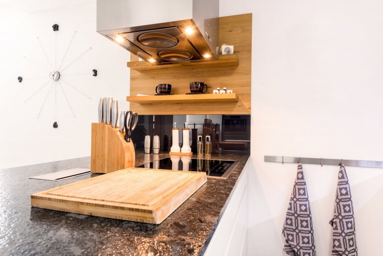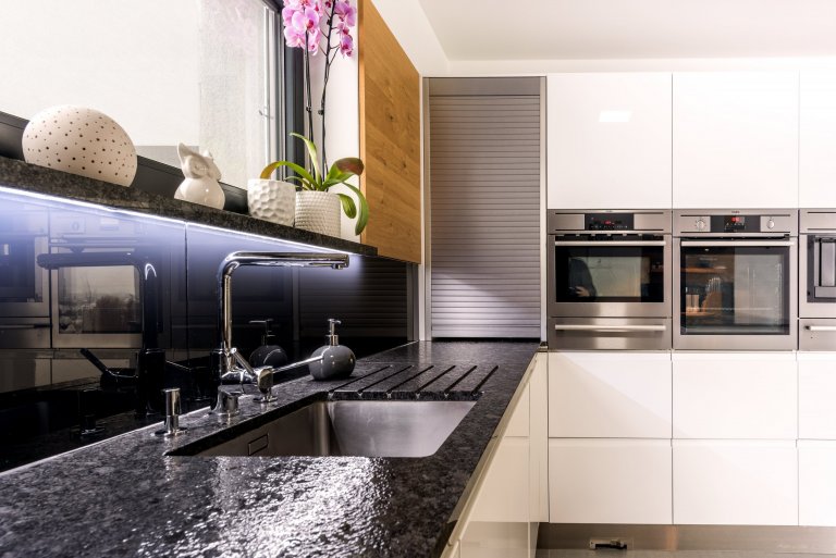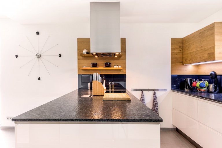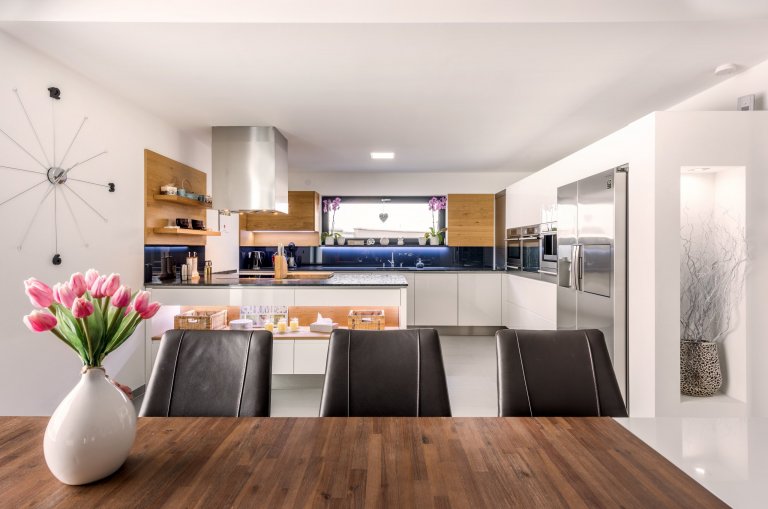 Kuchyně Pure rozzaří i váš dům. Trojkombinace trouby, mikrovlnky a kávovaru v ideální obslužné výšce. Dvoukřídlá americká lednička přímo po ruce. Jednolitý blok skříní zakončený nikou. Bílé plochy se střídají s dubovým obkladem, navazující ostrůvek a pracovní plochy jsou pokryty žulou, parapet je podsvícen efektním LED systémem. Všechno je zde dokonale naplánováno, aby vás výsledek pokaždé příjemně překvapil.