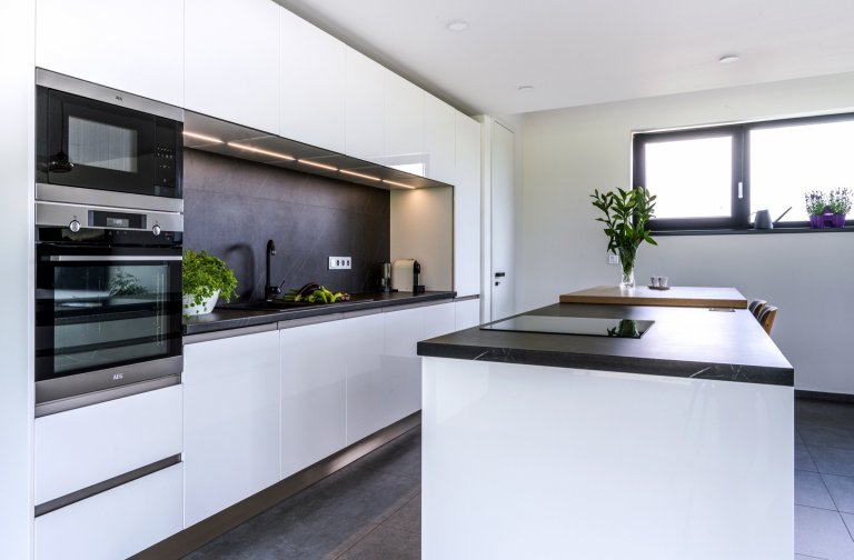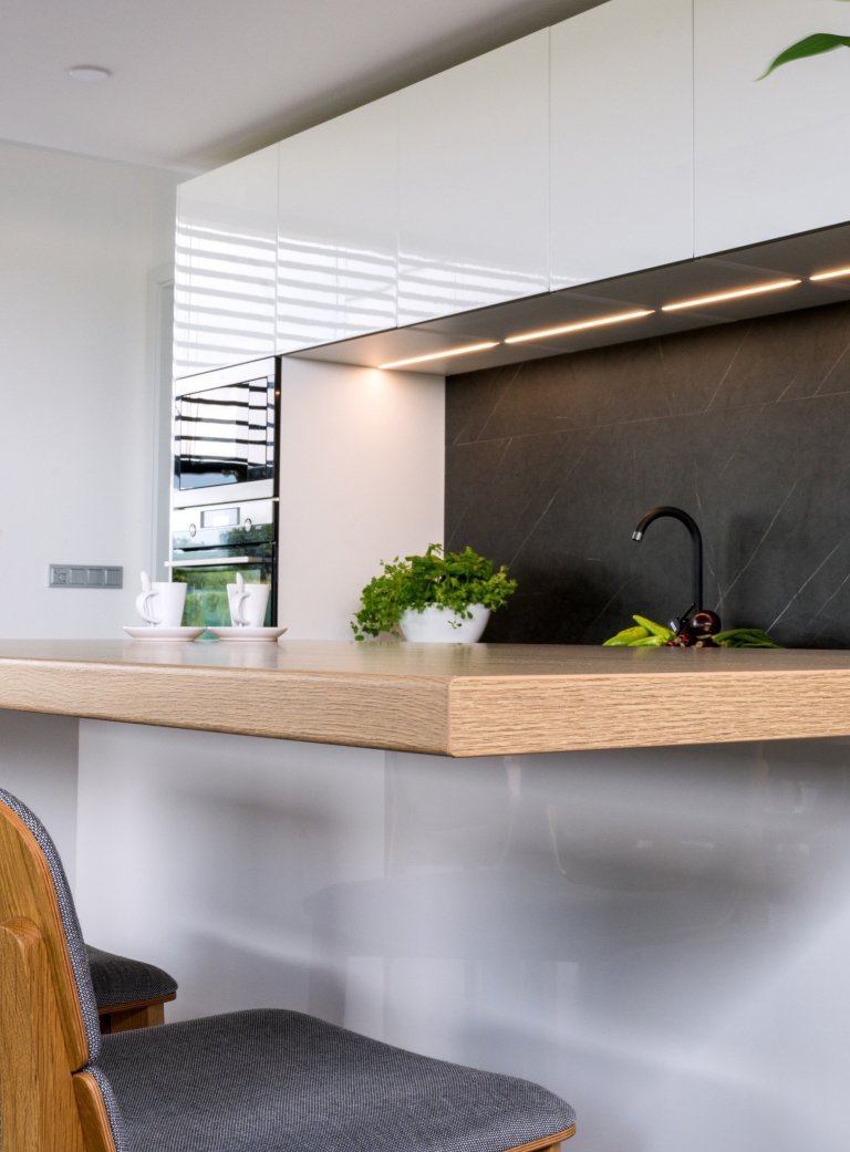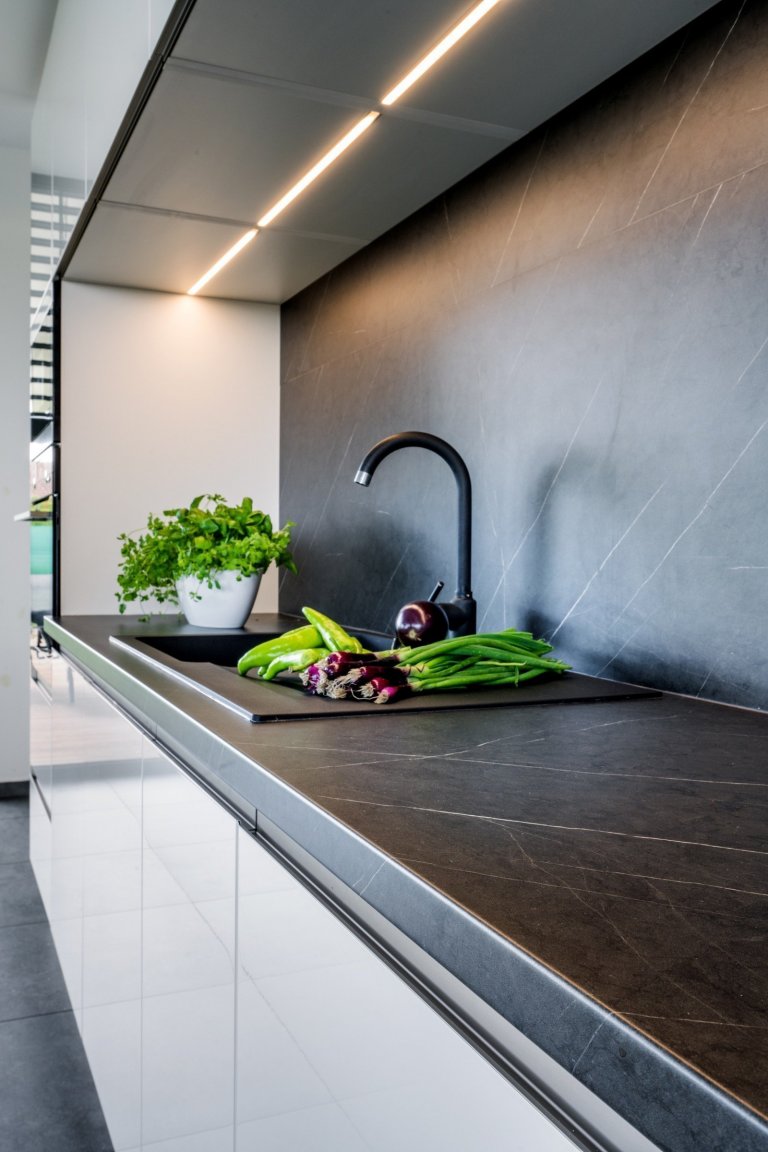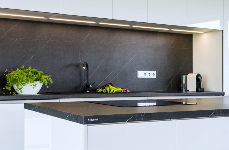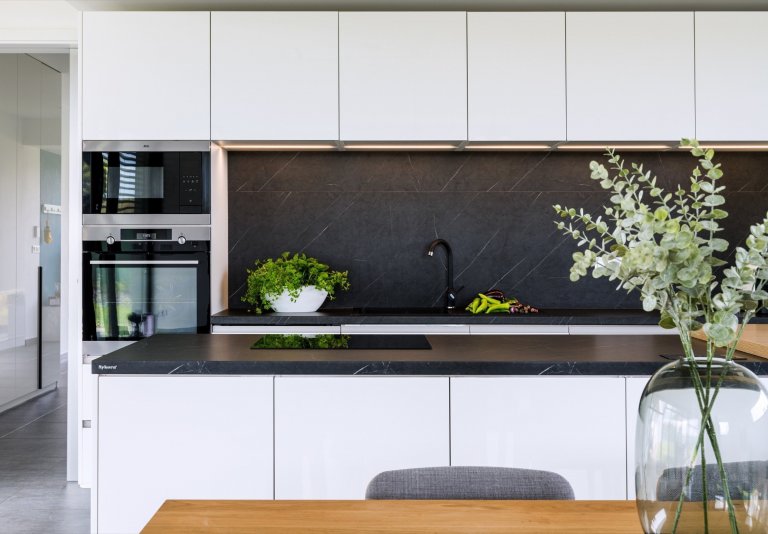 Legendární kombinace? Nadčasová elegance? Ikonický design? Spojení bílé s černou má spoustu zavedených pojmenování a všechny do jednoho jsou přiléhavá. I v tomto případě vytváří mix světlých ploch s tmavými prvky až mysticky svěží atmosféru, ve které se dynamicky střídají nejen barvy, ale i pocity - od prvotního úžasu přes nadšení až po radostné uspokojení z výborné volby. Černobílá kuchyně nikdy nezevšední, stejně jako nezestárne její vizuální přitažlivost. Mladí manželé vsadili ve spolupráci s designérkou Sykora na sestavu v bílém korpusu Top lak lesk White; do kontrastu s tmavým dřezem, tmavým obložením a atypickou černou baterií. Atraktivní vzhled se tu potkává s praktičností. A organizovaný řád s čistou, velkorysou vzdušností. Vše realizované v jedinečném, na míru vytvořeném projektu.