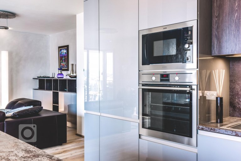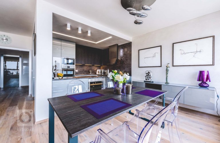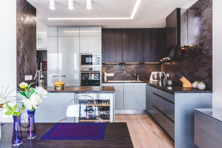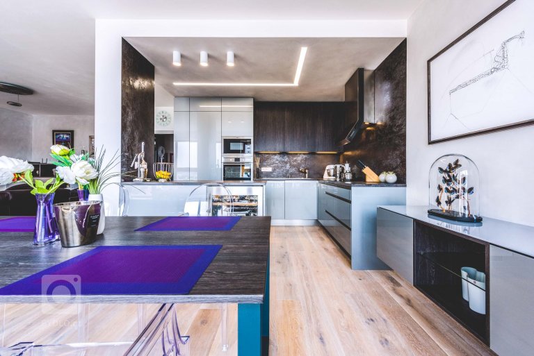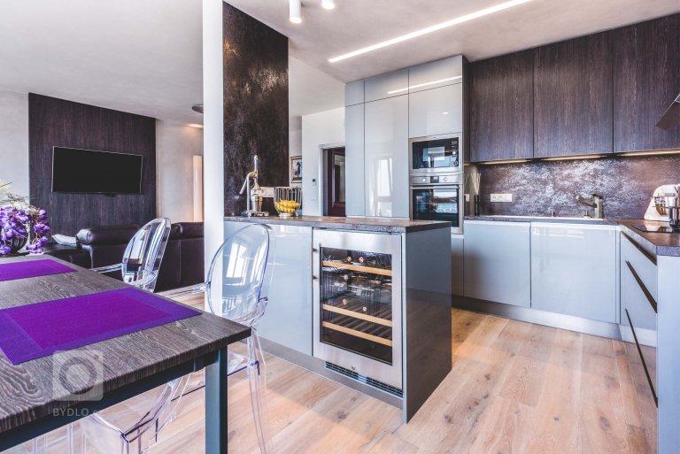 Všechno je tu dokonale sladěné. Každá barva, každý materiál, každý tón i každá emoce. Světlé plochy navazují na tmavé, teplá místa na vzdušnější, lesk doplňuje mat, dřevo se střídá s kůží a radost s uspokojením. Keramická pracovní deska Oxide Nero si perfektně rozumí s metalízovým obložením stěn stejně jako s neokázalou elegancí linky v provedení Top Acryl Silver Grey. Nejmodernější technologie spotřebičů AEG citlivě vyvažují archivní vína ve vinotéce Liebherr. Od jídelního stolu po stolky v ložnici, nic nebylo ponecháno náhodě. Je tak snadné cítit se tu výjimečně i během obyčejného, všedního dne.