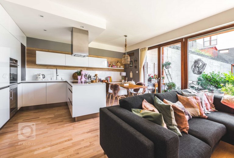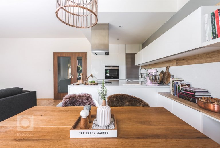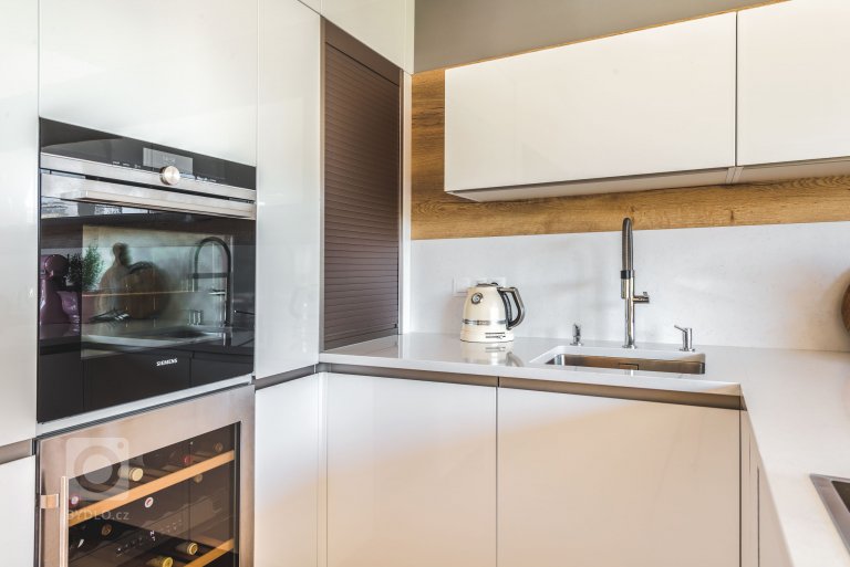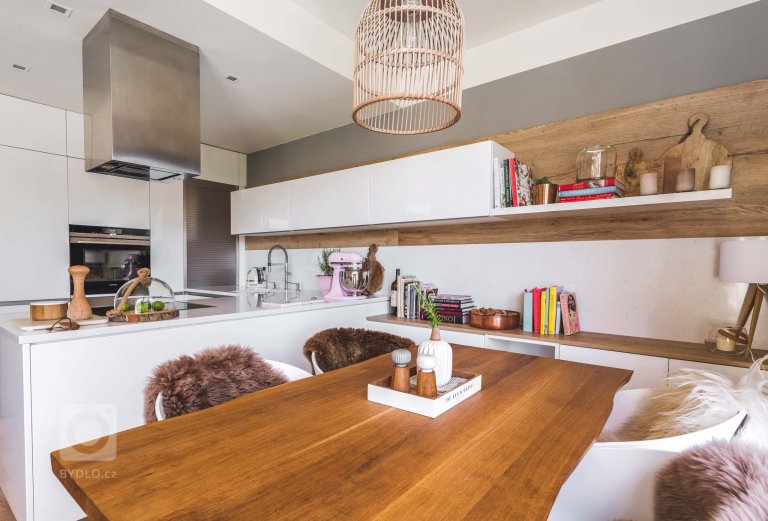 V kuchyni Top White Gloss se od první chvíle budete cítit jako doma. Vše je tu vyladěno přesně tak, jak to máte rádi. Vysoká potravinová skřín s výsuvem širokým 30 centimetrů vám umožní maximálně pohodlný přístup k surovinám. Otočíte se a před sebou máte velkorysou pracovní desku s obkladem Technistone. Otočíte se ještě jednou a rovnou můžete podávat na rozměrný jídelní stůl pro čtyři. Masivní stůl elegantně propojuje dřevěnou podlahu a prvky ve světlém dekoru Dub Straight, které prostupují celou linkou. Ta je z lesklé bílé fólie, se zafrézovaným horním LED osvětlením, nerezovou roletkou a nerezovými úchytkami. Krásně prosvětluje prostor a s ním i atmosféru. Jestliže toužíte po harmonickém, praktickém a zároveň uchvacujícím řešení, tahle kuchyně rozhodně patři k vám do rodiny.