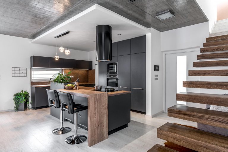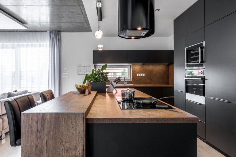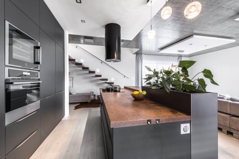 Představujeme řídící místo celé domácnosti. Kuchyni Trend Matt Antracit, kde se sbíhají všechny důležité rodinné okamžiky a rodí všechna zásadní rozhodnutí. Prostor, v němž dáváte okolnímu světu najevo svou nezdolnou chuť k životu. V této sestavě by se charisma a důstojnost daly krájet. Tmavé akcenty perfektně ladí s bílými zdmi i světlou podlahou, komínový odsavač diktuje tempo vzdušných schodů stoupajících vzhůru a svěží zeleň ve vestavěných květináčích podtrhuje magnetismus celého řešení. Všechno je tu promyšleno do posledního milimetru a ještě dál. Pracovní deska i obklady mají karamelový nádech Ferro Bronzo, zatímco skříně jsou zakončeny fóliovanými dvířky v provedení Trend Matt Antracit. Střídání dvou hlubokých tónů je pastvou pro oči. Solitér s varnou deskou byl otočen směrem do místnosti a zakončen barovým pultem z tmavého dubu Straight. Mycí centrum prosvětluje horizontální okno, které do kompaktní sestavy kromě slunce vnáší i drzou rafinovanost. Tahle kuchyně vás dostane do vítězné nálady ještě dřív, než stačíte otevřít lednici a vytáhnout svůj narozeninový dort.