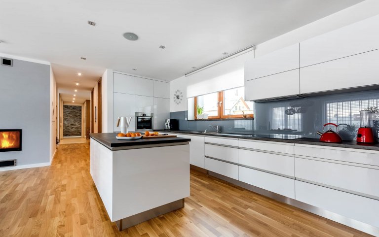 Velkorysý prostor vyžaduje velkorysé řešení. Podlouhlou linku v čistém bílém provedení rozšiřuje solitér s pracovní plochou z tmavého betonu. Každé krájení nožem se tu mění v estetický zážitek. Stěna z barevného kaleného skla nádherně ladí s rozměrným masivním dubovým stolem i dvouoknem s výhledem do zahrady. V této kuchyni je spousta místa pro kulinářské experimentování a ještě víc prostoru pro spokojenost.