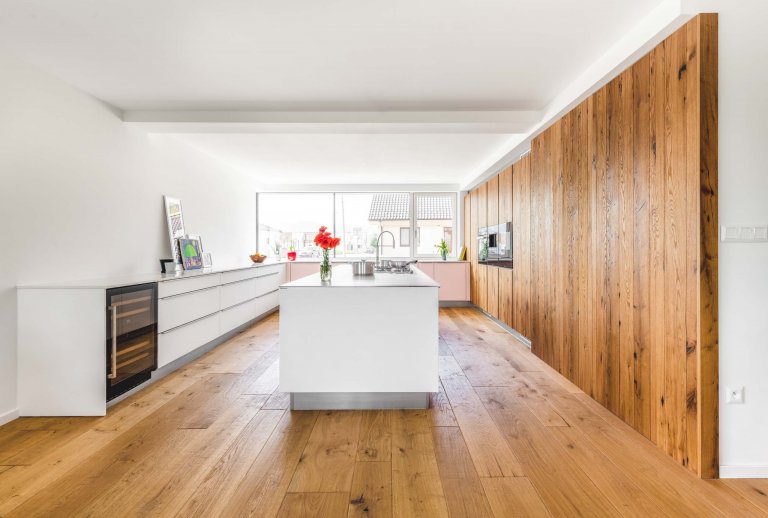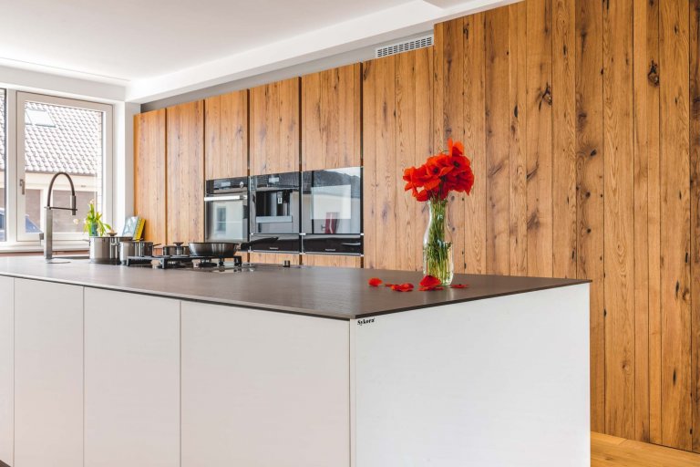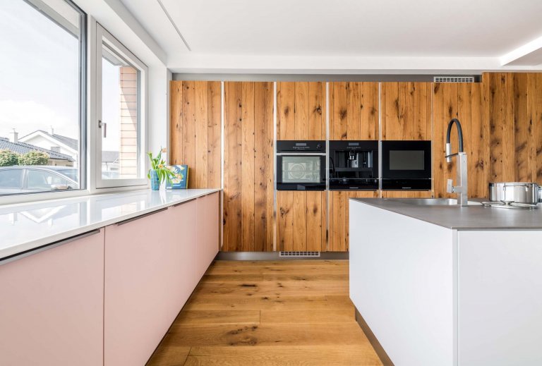 Proč by nás zdi měly oddělovat od přírody? V této kuchyňské sestavě se venkovní krása přirozeně propojuje s domácím komfortem a nabízí svým majitelům výhody obou světů: nezávislost i kontrolu. Jedna z bočních stěn je obložena dýhou v provedení Dub starý a za tygrovitě žíhanými fošnami rafinovaně skrývá moderní poklady - vysoké zásuvkové skříňky, zabudované spotřebiče i neviditelnou lednici. Stěna se navíc elegantně přesunuje na celodřevěnou podlahu, díky čemuž si připadáte jako v romantickém srubu a téměř vnímáte vítr ve vlasech. Uvnitř všeho je zasazen centrální ostrůvek pokrytý nerezovou pracovní deskou s mycím i varným centrem a odsávacím systémem Bora. Stiskem tlačítka se z alboreta dostanete do kulinářské laboratoře. Půvabné spojení zemité krásy přírodních materiálů a špičkových technologií podtrhuje také jemná pink barva úložných boxů pod oknem. V této kuchyni se příroda cítí doma. A vy s ní.