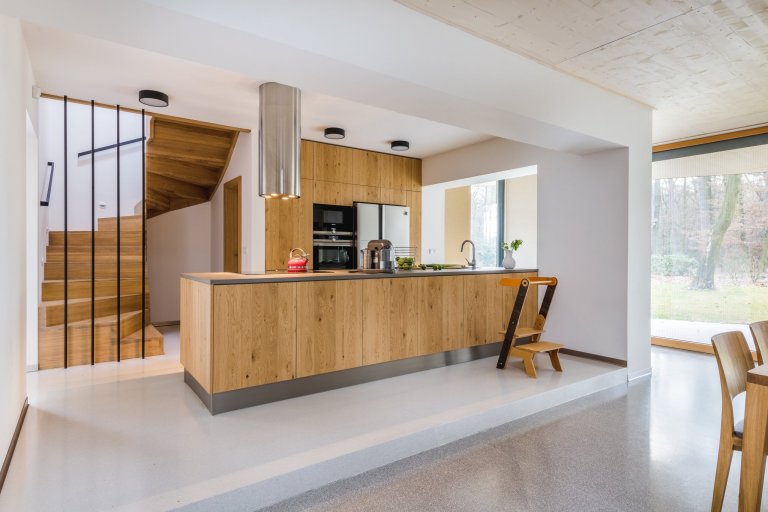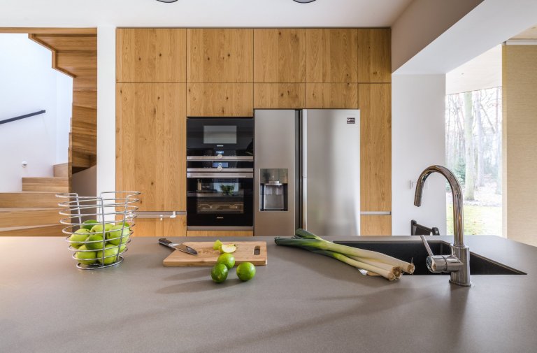 V této kuchyni byl prostor na vše, jenom ne na ústupky. Zadání bylo jasné: umět propojit dřevo s pokročilými technologiemi a domáckou atmosféru s otevřenou, prosklenou dispozicí. Stejně jako ve zbytku interiéru je proto i v kuchyňské sestavě hlavním materiálovým prvkem dub. Jeho žíhané suky působí hřejivě a bytelně, a zároveň krásně navazují na les v okolí. Ergonomii kuchyně utváří dva fortelné bloky – sada vysokých skříní vytáhlých od podlahy až ke stropu, a před nimi vyrostlý pracovní ostrůvek s 30 mm keramickou pracovní deskou v dekoru Cement. Díky svým robustním rozměrům solitér šikovně obsahuje jak mycí, tak varnou zónu s nadstandardně širokou indukcí. Do skříní se podařilo zasadit kombinaci pečících trub i obří americkou chladničku: která tak elegantně zapadá do interiéru a nestojí rušivě stranou. Velké věci i nápady se zde spojily do jedné kompaktní siluety – harmonicky souznící se zbytkem domu i s jeho přírodním charakterem. Tady se žije výjimečně každý všední den.