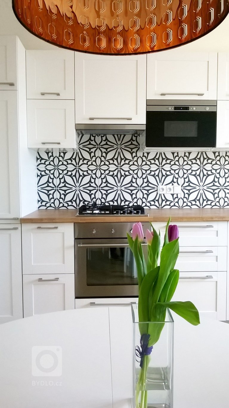 Hlavním motivem interiéru je černobílý retro obklad za kuchyňskou linkou a v koupelnách. Teracovou podlahu vstupní chodby, dubové parkety a původní dveře jsme nechali zrepasovat.