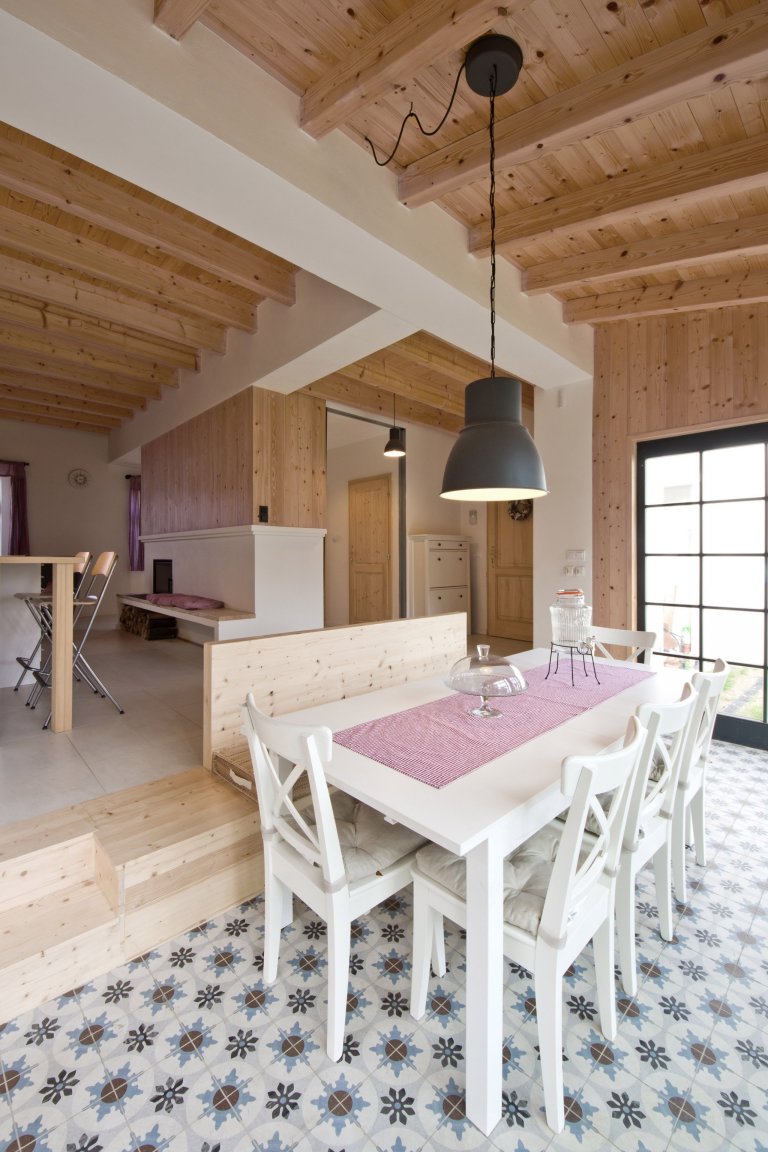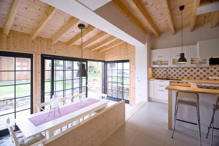 Přízemí jsou rozšířili do zahrady o dřevostavbu a tak vznikla prosklená jídelna s velikým stolem pro velké rodinné sešlosti. Ústředním prostorem přízemí je krb s dřevěnou lavicí, oblíbené místo pro stále zmrzlé. Strop je dřevěný, trámový. Jednotlivé místnosti v přízemí mají různé výšky a tak i místnosti v patře jsou na různých výškových kótách.