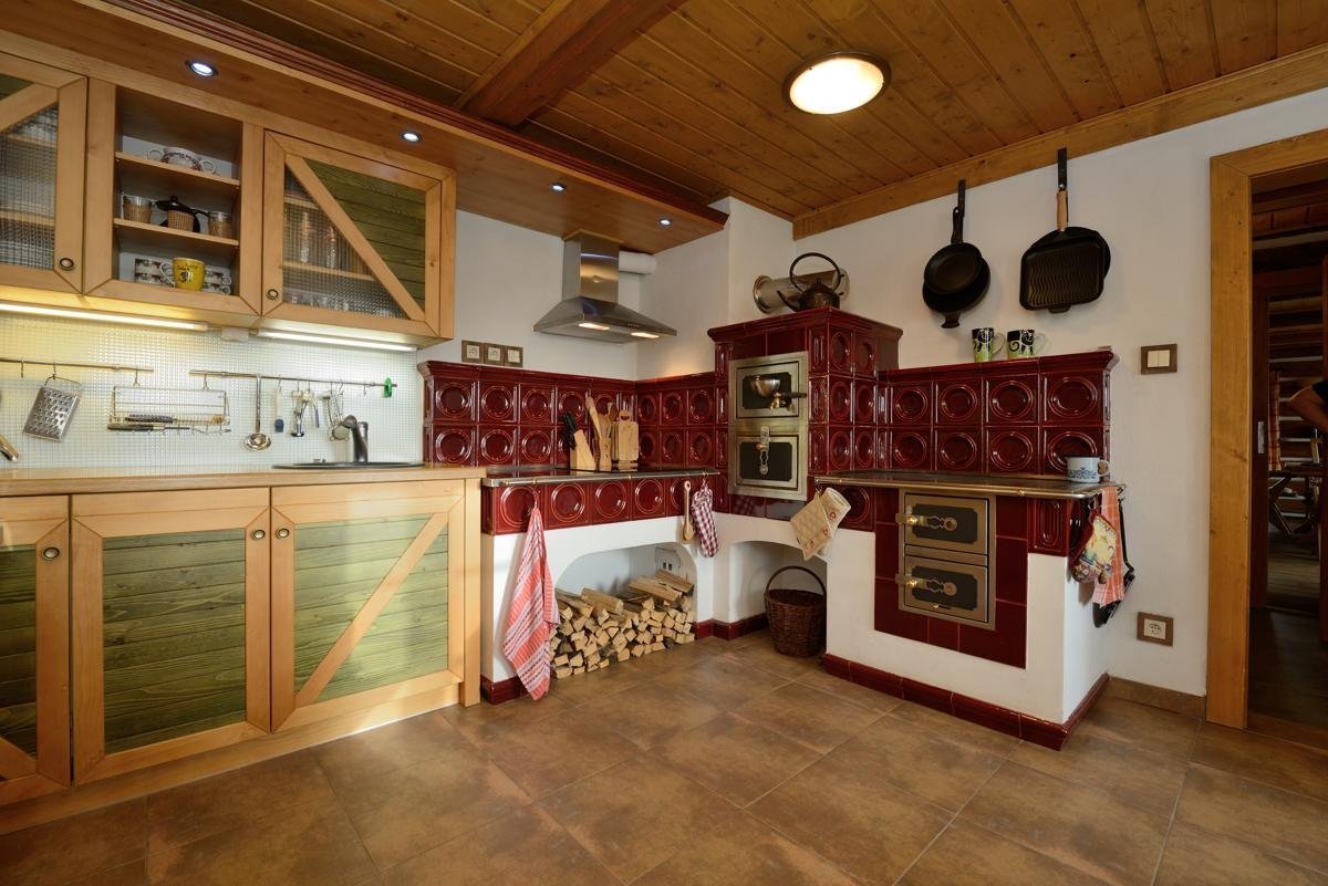 Šarlatově červený KACHLOVÝ SPORÁK jsme realizovali do krkonošské chalupy pro zákazníka, který avizoval, že bude kuchyně využitá opravdu permanentně. Ostatně požadavek na začlenění elektrické varné desky a rozměry celé kuchyně napovídaly, že roubenka opravdu čeká velké rodinné sešlosti.