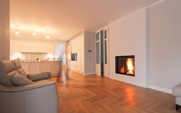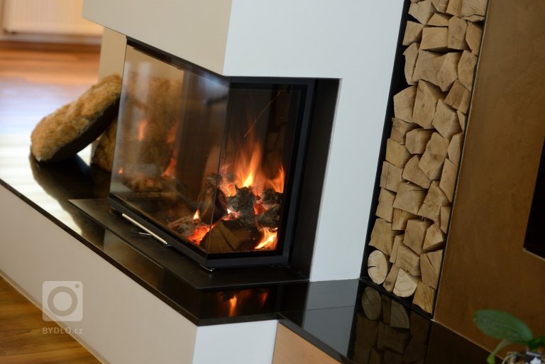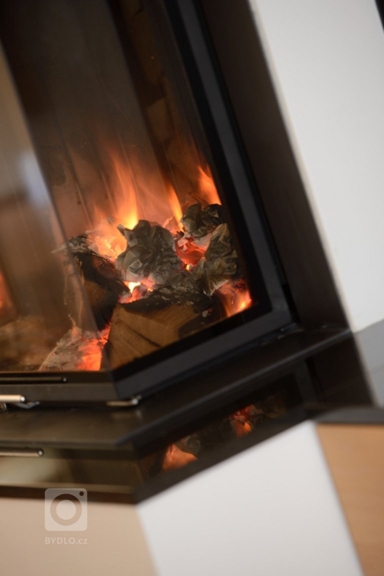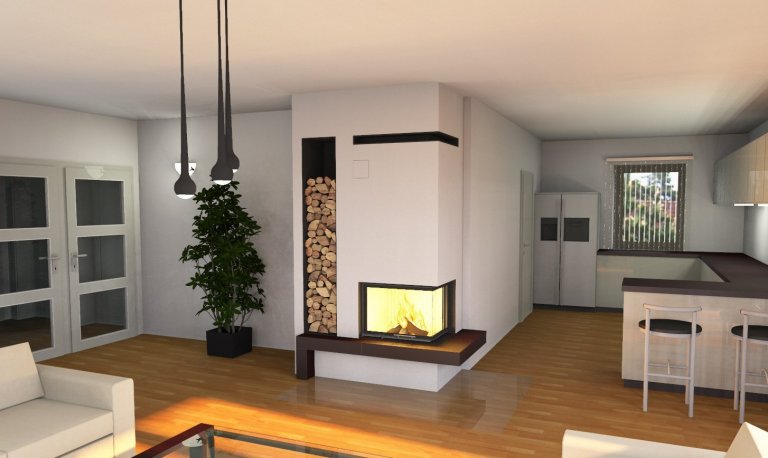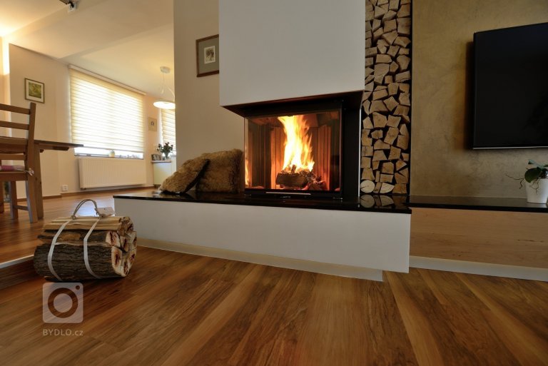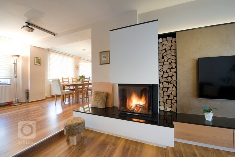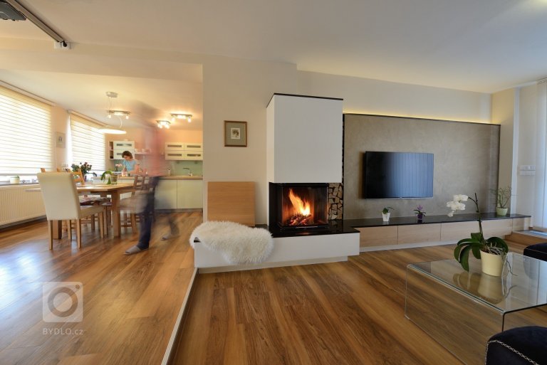 Třístranný krb s vestavěnou krbovou vložkou Brunner Panorama, žulovou spodní římsou a obestavbou z omítaného šamotu dělá radost v Praze - Kunraticích našemu zákazníkovi, který pochopil, že nás baví řešit krby v kontextu interiéru a ne jako vytržený solitér. Díky jeho skvělé součinnosti byla realizována i efektní bronzová stěrka za TV, která krásně doplnila naše zlaté plameny...
