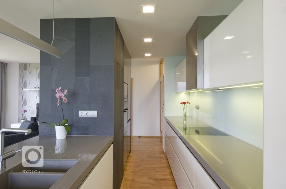 kuchyňská linka v odstínech bílé a šedé, v ušlechtilých materiálech jako je bílý lak, umělý kámen a skleněný obklad