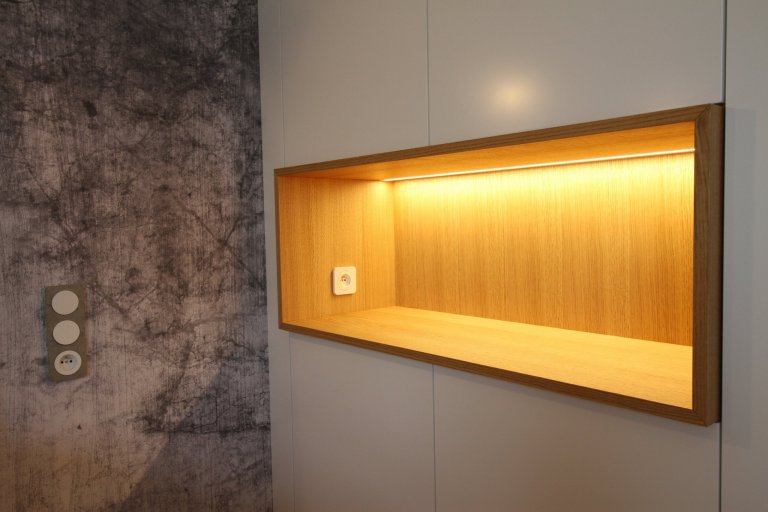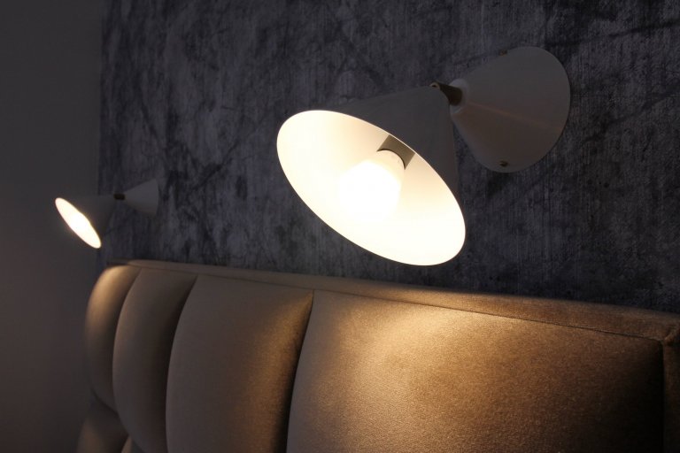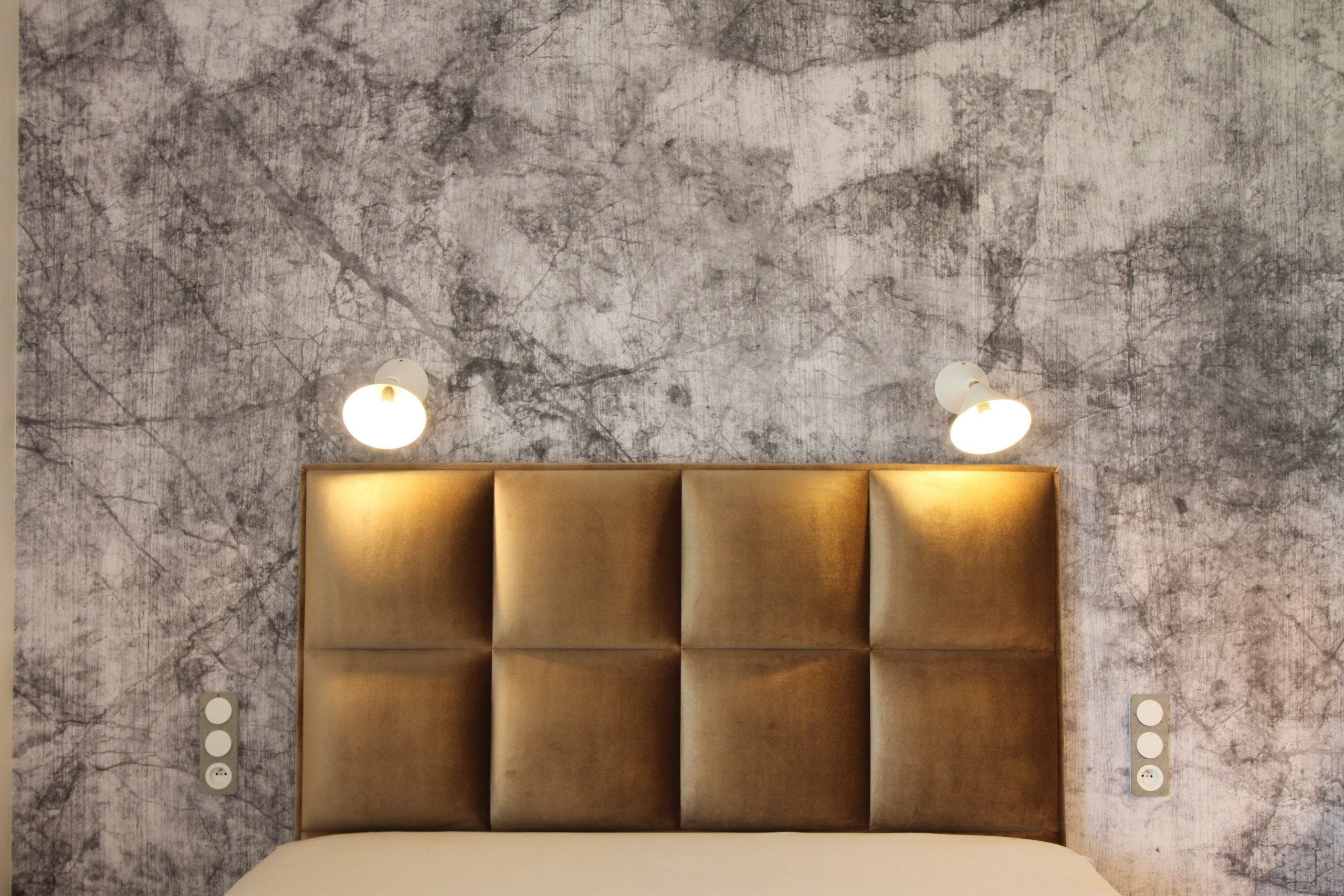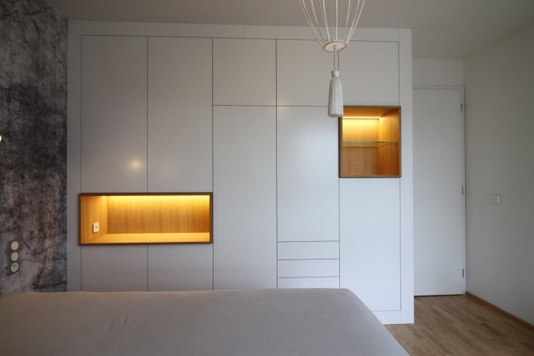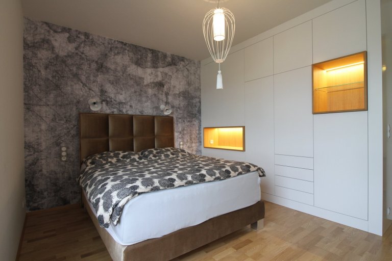 Interiér ložnice s italskou tapetou a svítidly, šatní skříň podle autorského návrhu.