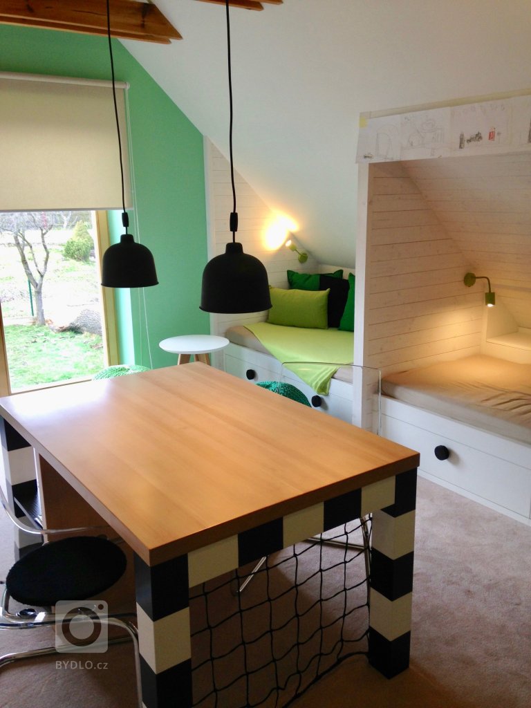 Cílem projektu bylo vytvořit dětský pokoj pro dva malé kluky milující hokej a fotbal. Toto zadání bylo základem konceptu a barevného schéma. Bylo potřeba využít šikmé stropy tak, aby vznikl prostor pro spaní, odpočinek, práci a samotnou hru..