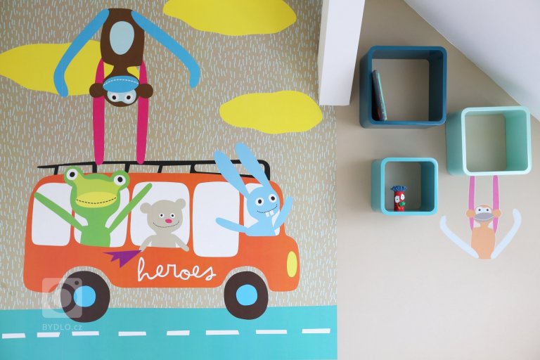 Dětský pokoj pro kluka. Základním motivem je výrazná tapeta se "zvířecím autobusem" od mé oblíbené české značky Lavmi. Bílý minimalistický nábytek oživují barevné akcenty - výrazný koberec, tyrkysové police, barevné stěny nebo úchytky na nábytku.