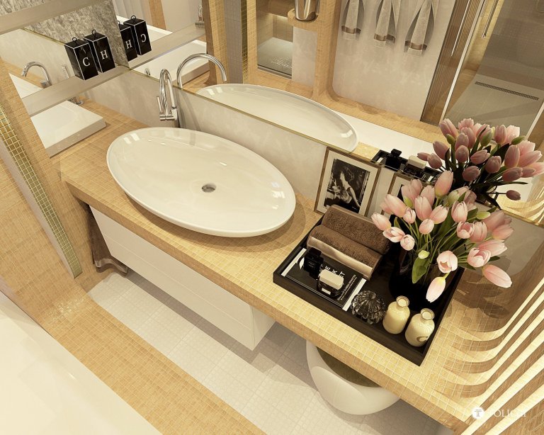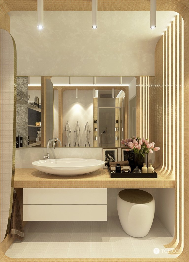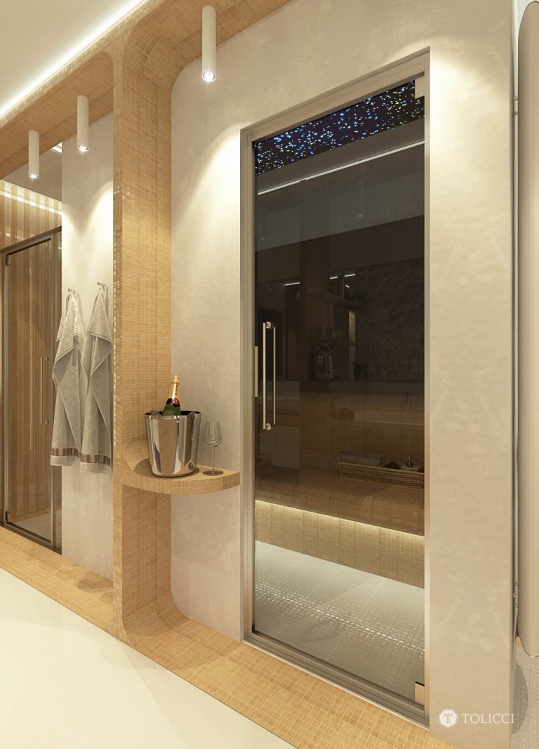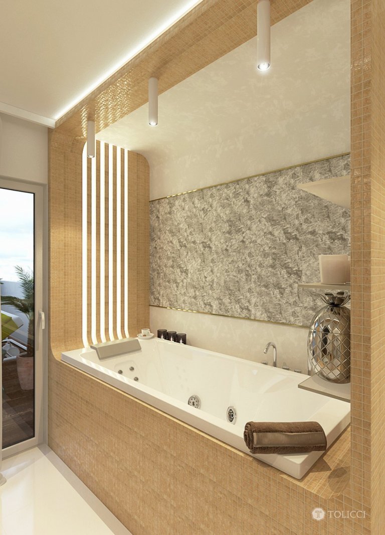 Návrh exkluzívnej kúpeľne vznikol na špeciálnu požiadavku klienta pre vytvorenie dizajnérsky výnimočnej apartmánovej kúpeľne so saunou. Kúpeľňa je vytvorená na priestorovom rozmiestnení jednotlivých funkčných zón. Dizajnérsky sme priestoru pridali na hĺbke za pomoci zvýraznenia jeho prirodzených kontúr perspektívy, jemnosť a mäkkosť sme priestoru dodali za pomoci oblých tvarov konštrukcií a zariaďovacích prvkov. Kombinácia travertínovej a zlatej mozaiky a špeciálnych umeleckých dekoračných stierok dodávajú priestoru jedinečnosť a exkluzivitu v identite tvorby interiérov TOLICCI.